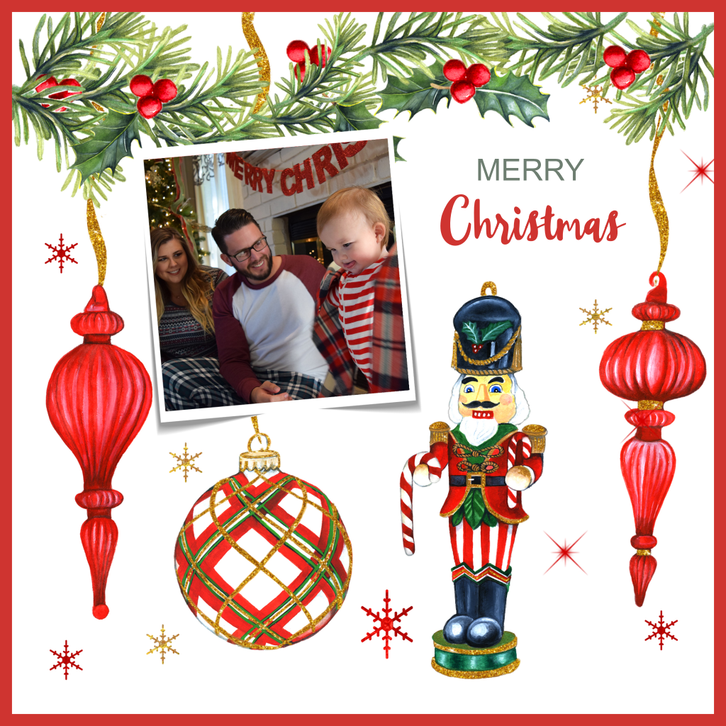 Kerstkaart met leuke notenkrakers en ornamenten met fotoframe. (22654)