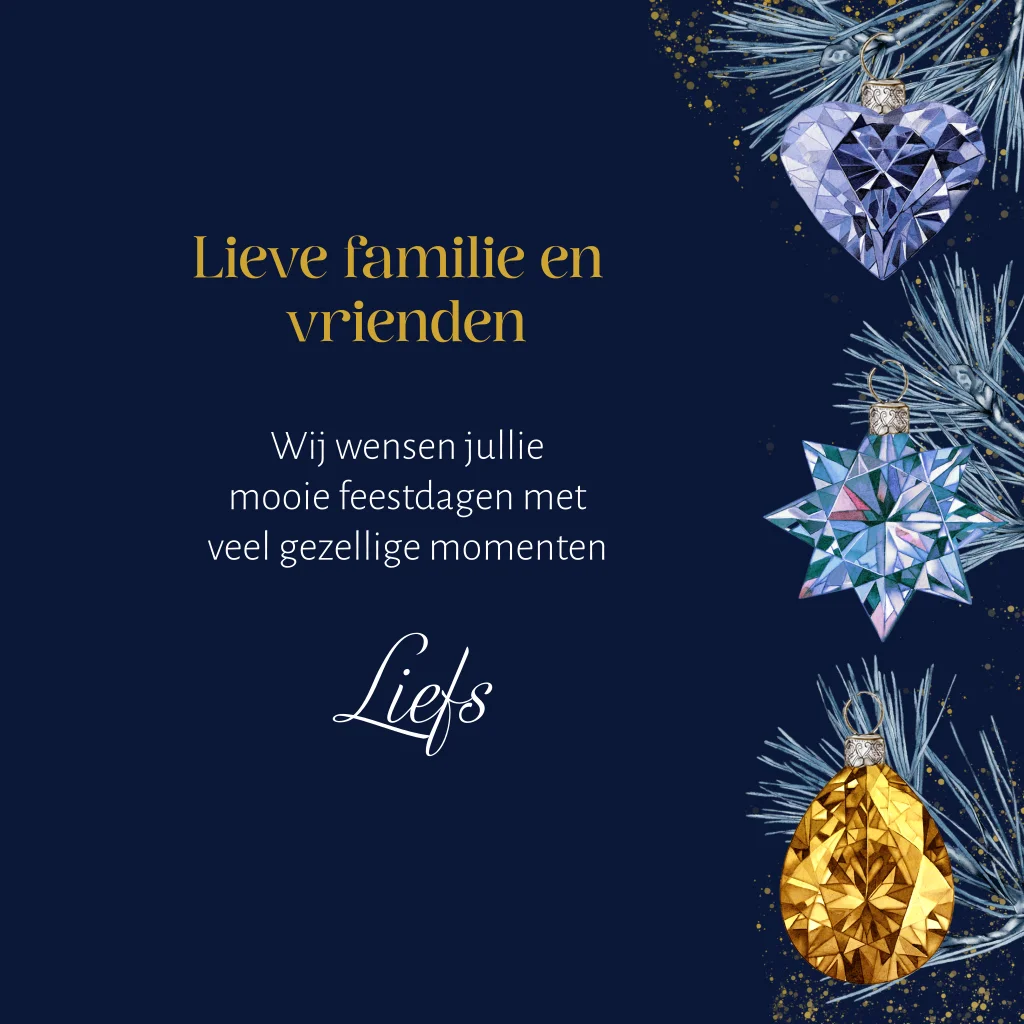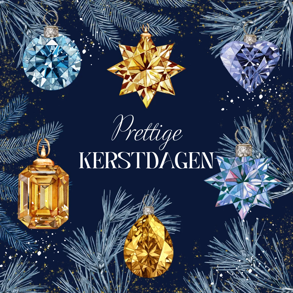 Kerstkaart met mooie ornamenten van glimmende juwelen in blauw geel goud en blauwe kersttakken. (30293) Leuk als kerstkaart voor een juwelier