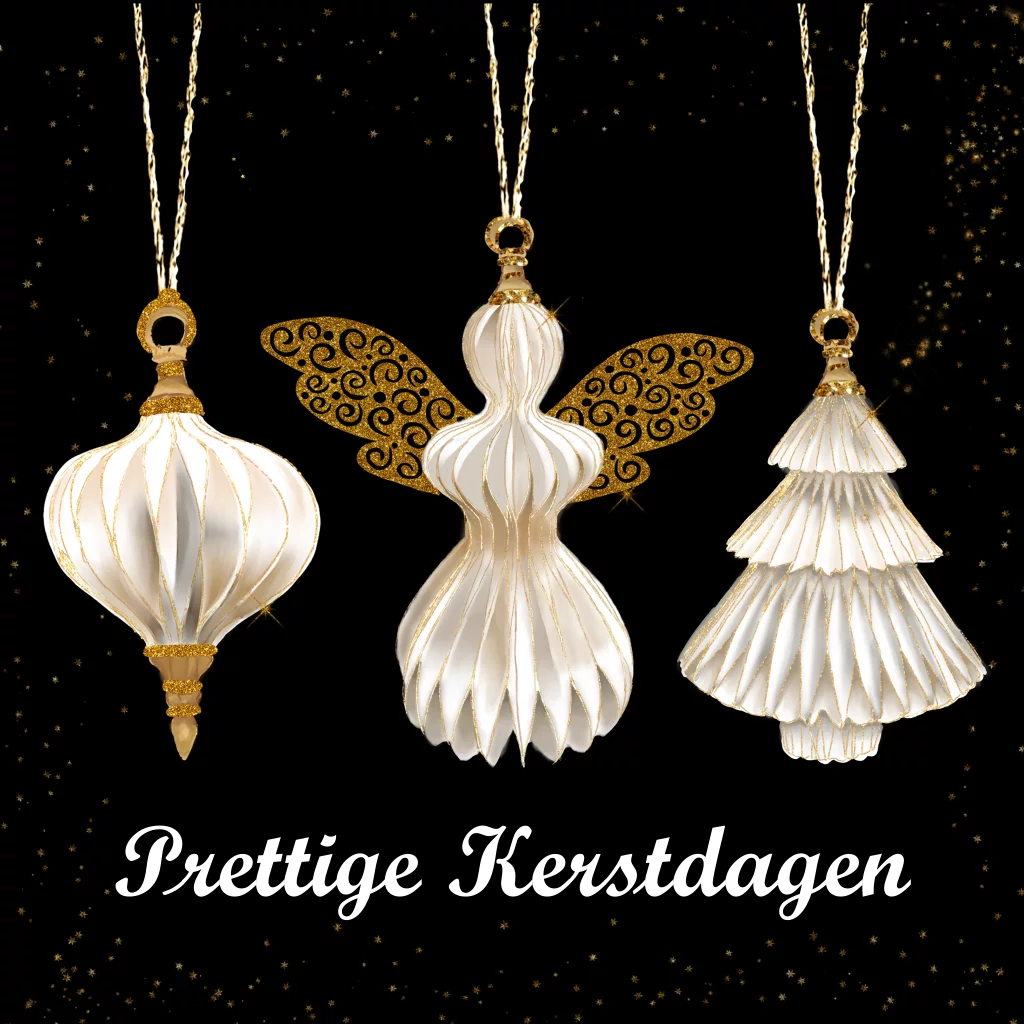 Kerstkaart met mooie ornamenten van papier en engeltje in het midden met echte olietekst. (24307)