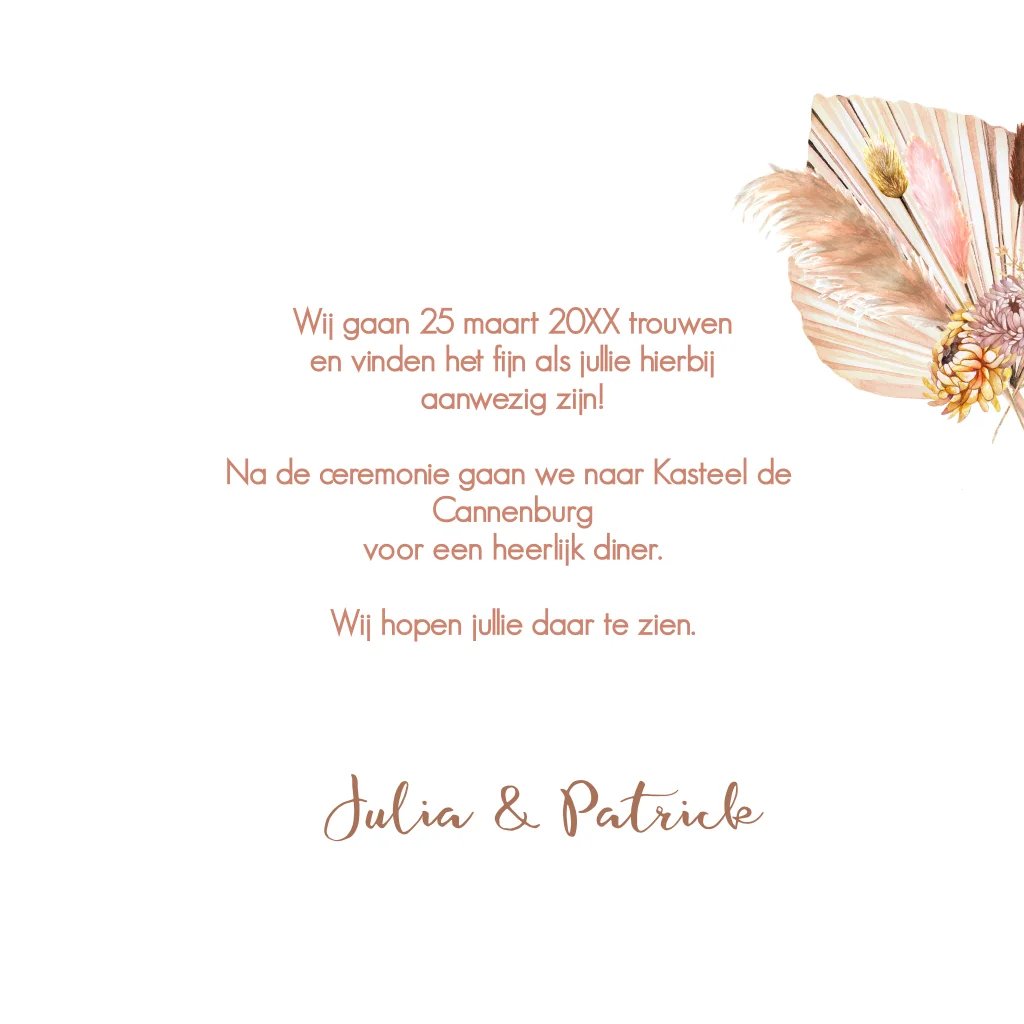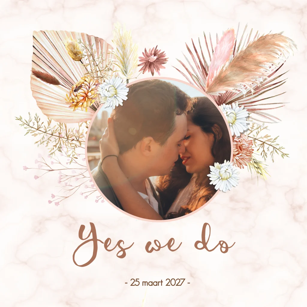 Bohemian style trouwkaart met droogbloemen rondom het fotokader. (22028)
