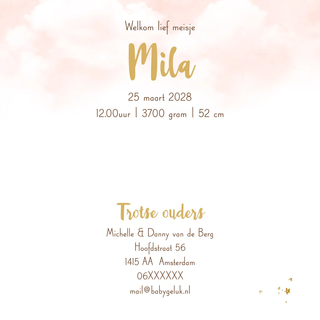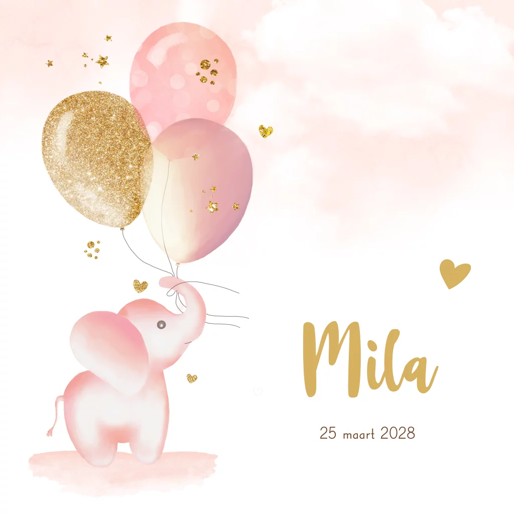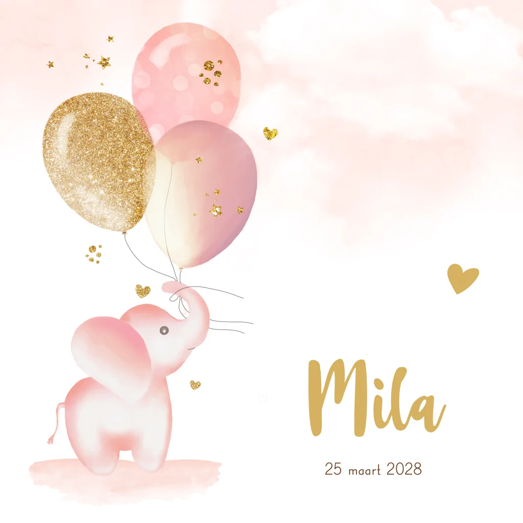 Lief getekend geboortekaartje voor een meisje met olifant die ballonnen in slurf vasthoudt. Op een roze achtergrond. (23916) Geboortekaartje Mila