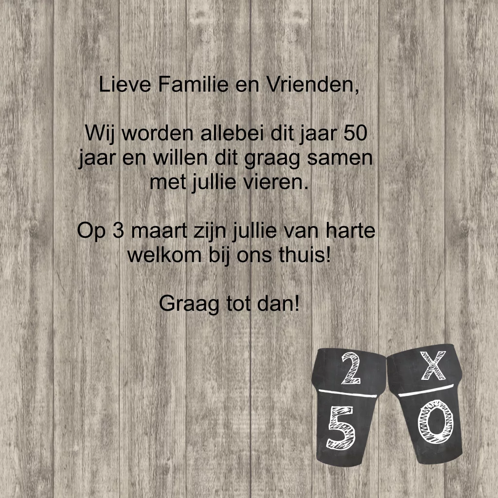 Uitnodiging 50ste verjaardag met krijtbord en bierglazen met handletteringteksten op hout. (3731)