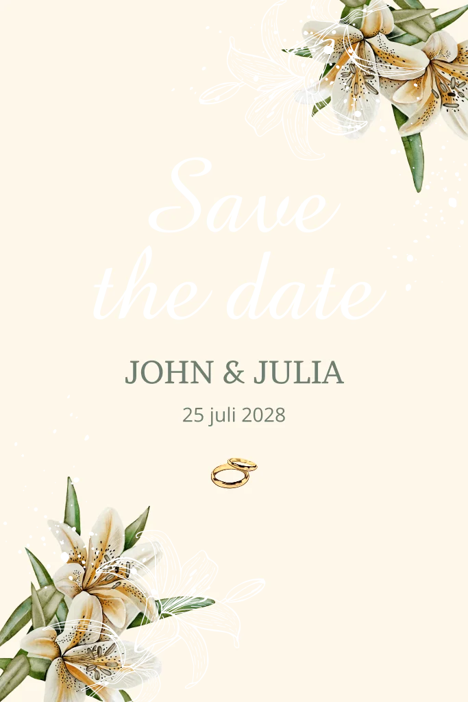 Save the date uitnodiging trouwerij als jullie gaan trouwen met witte lelie. (30135)