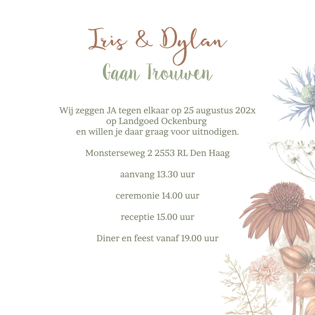 Deze stijlvolle trouwkaart met veldbloemen straalt warmte, rust en natuurlijke schoonheid uit. Het ontwerp combineert zachte crèmekleurige achtergrondtinten met een gedetailleerde illustratie van diverse bloemen in warme rood-, oranje- en blauwtinten. De combinatie van korenbloemen, distels, zaaddozen en wilde veldbloemen geeft de kaart een sereen en liefdevol karakter. (24741)