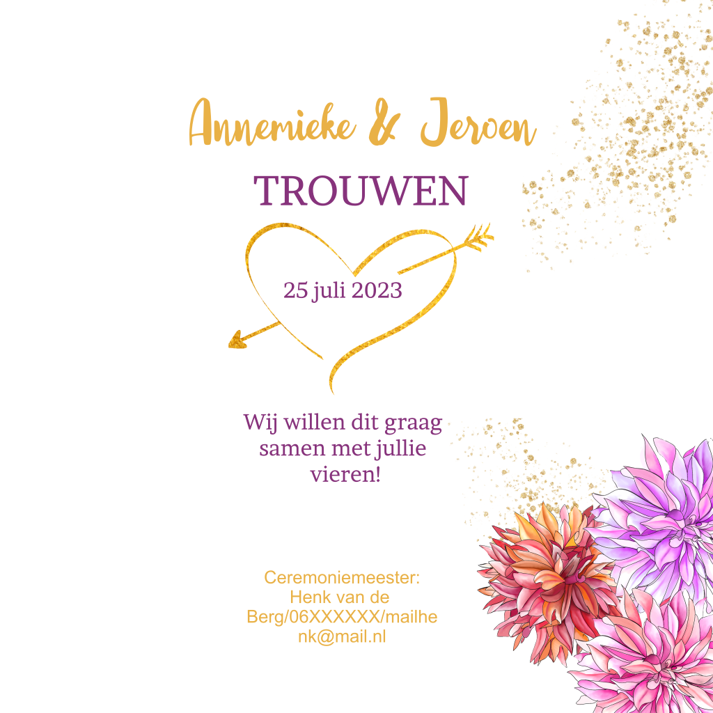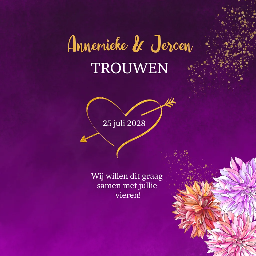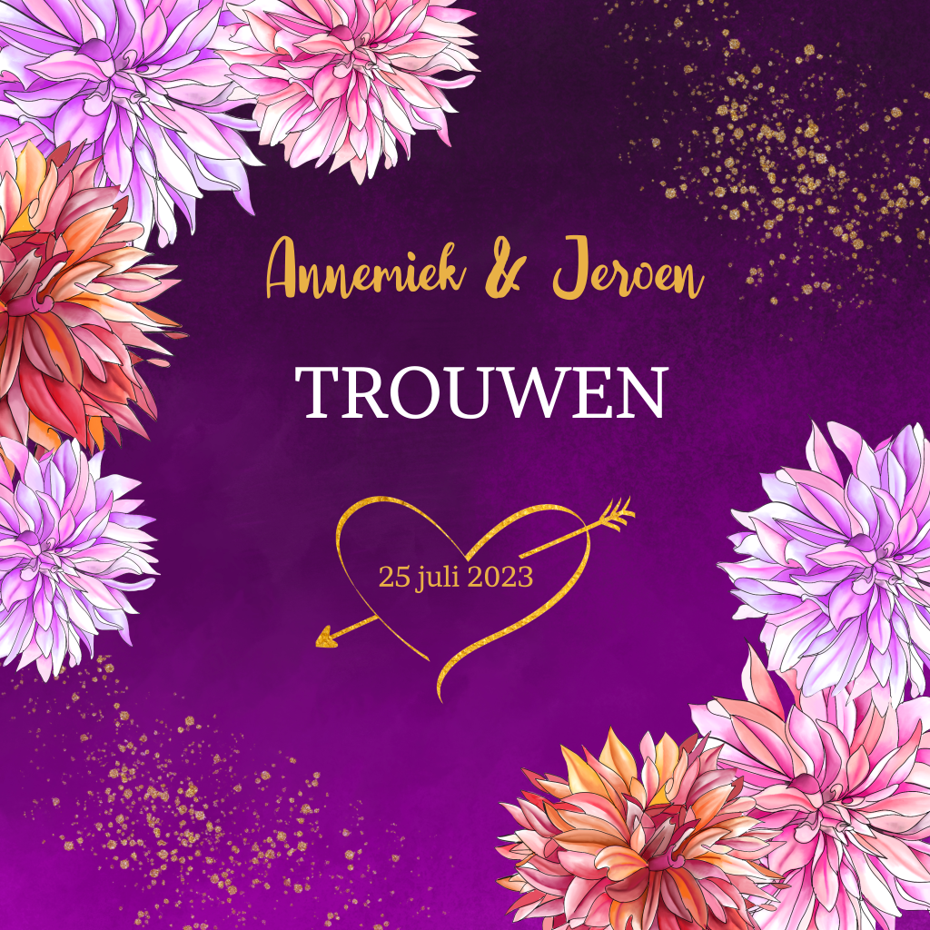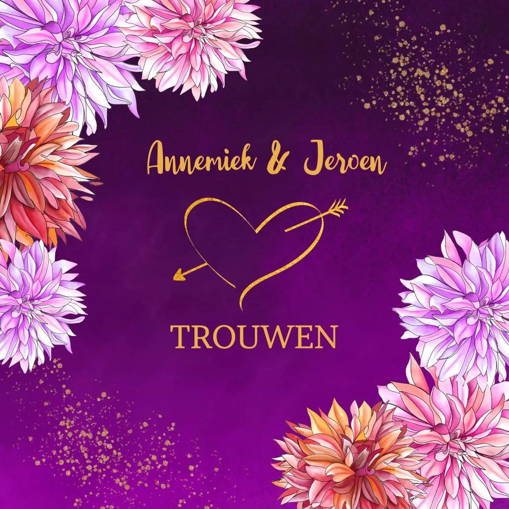 Trouwkaart met mooie dahliabloemen in pastel op dieppaarse achtergrond versierd met goud-look glitter. (8120)