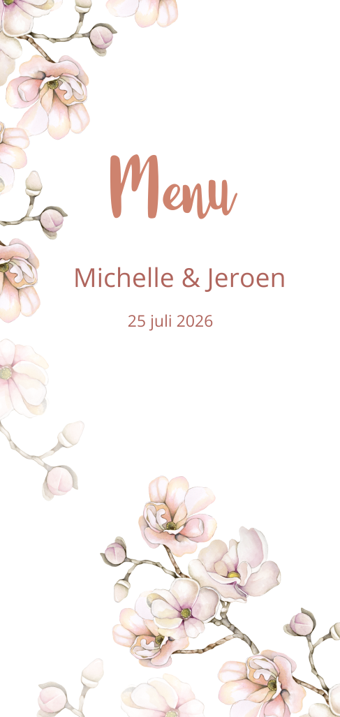 Menukaart voor trouwen met magnolia bloemen roze wit. (23899)
