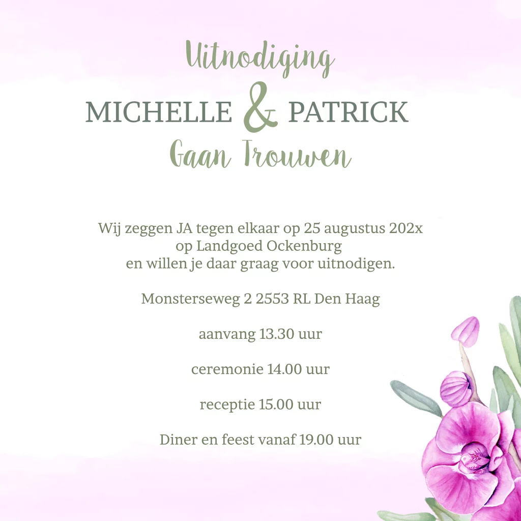 Trouwkaart met mooie getekende orchidee in paarsrood / lila met de hand gemaakt in aquarel. (21458)