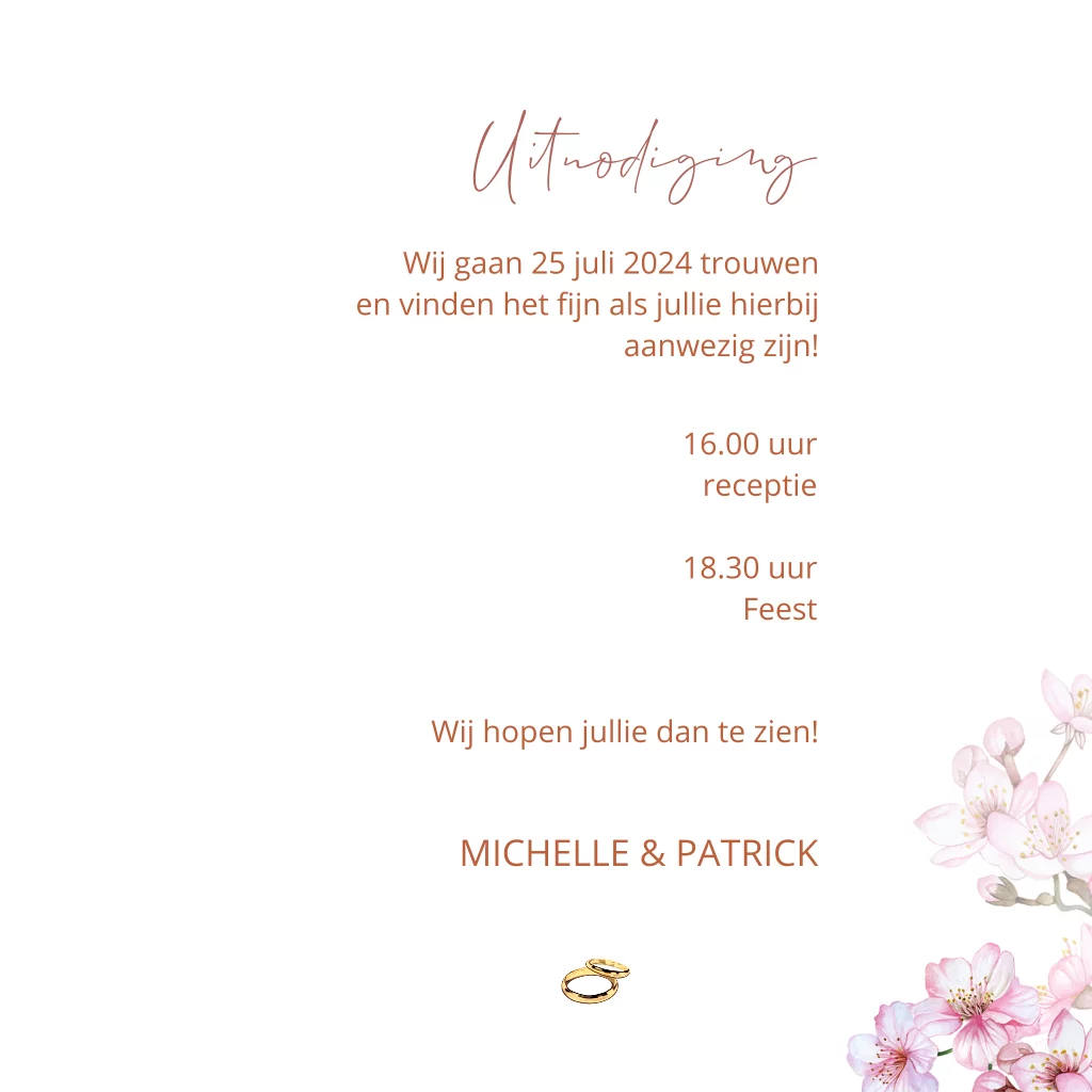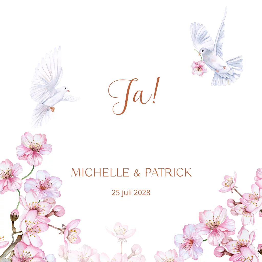 Trouwkaarten met roze bloesem bloesem en witte duifjes / duiven om jullie gasten uit te nodigen voor jullie bruiloft. (23446)