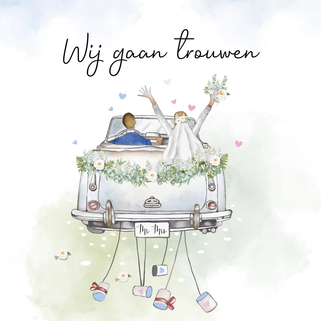 Leuke trouwkaart met een bruidspaar in een oldtimer