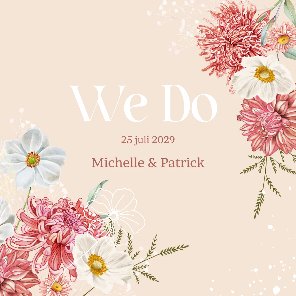 Trouwkaart met mooie getekende dahliabloemen en herfstanemoon in wit en roze tinten en goudfolie tekst en spetters. (30126)