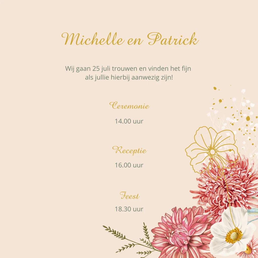 Trouwkaart met roze dahlia bloemen met goudfolie