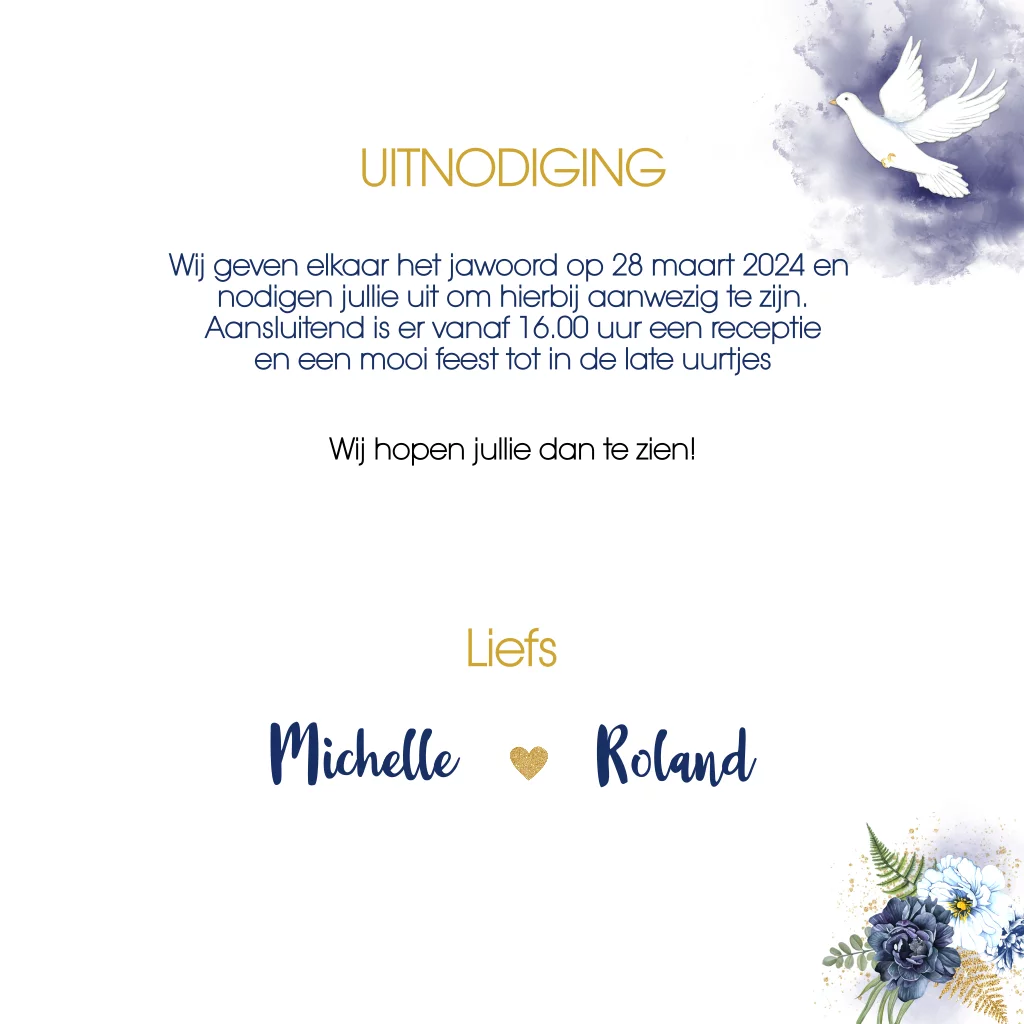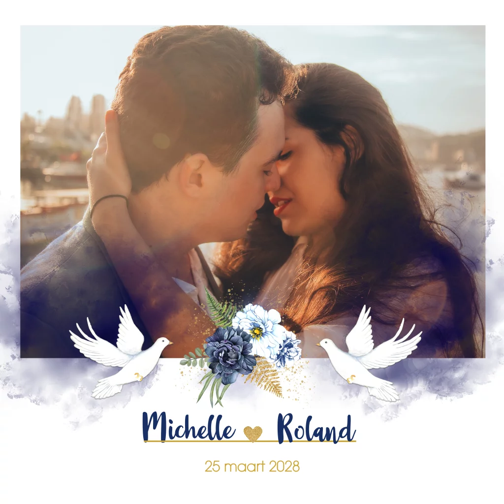 Trouwkaart met duiven en blauwe rozen versierd met goudglitter look. (20742)