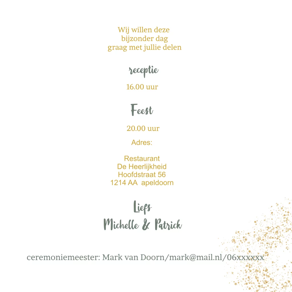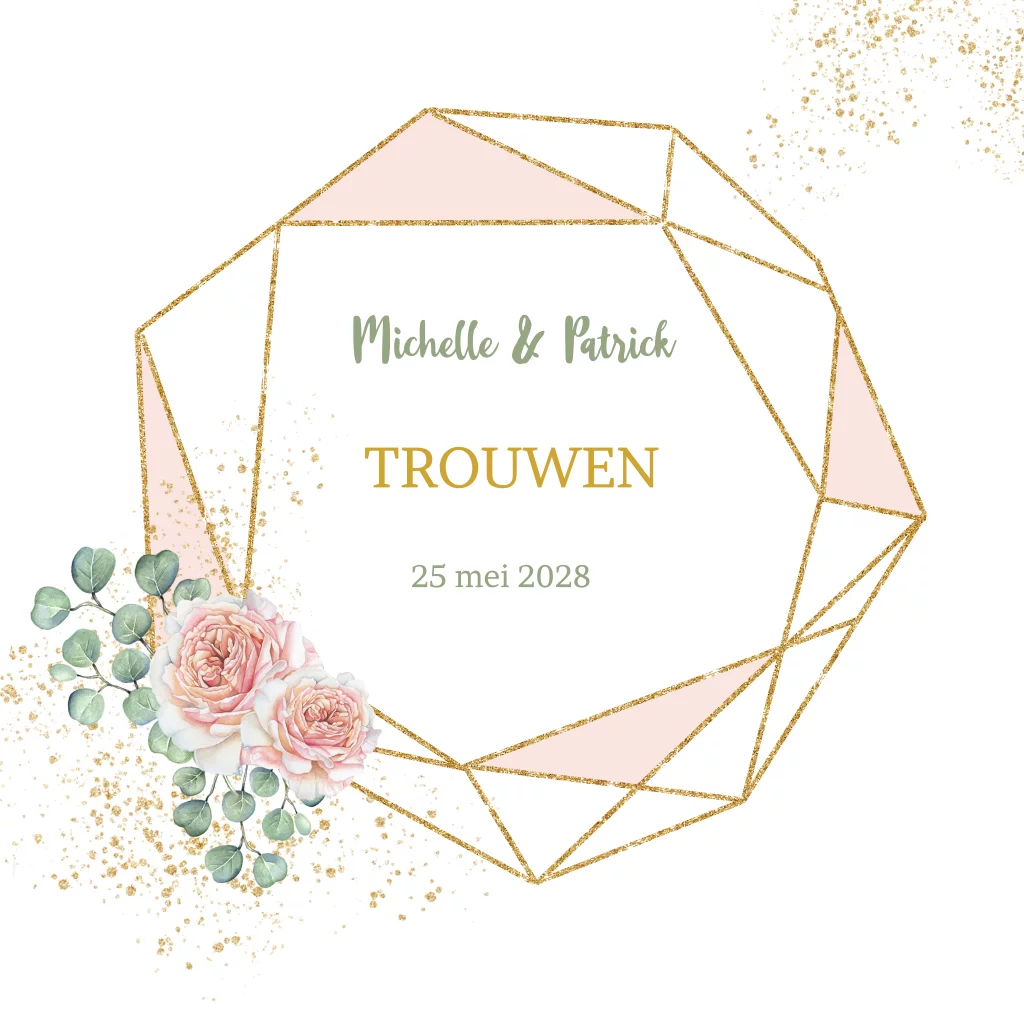 Trouwkaart met mooie rozen op geometrisch patroon in goudkleurige glitter. (8199)