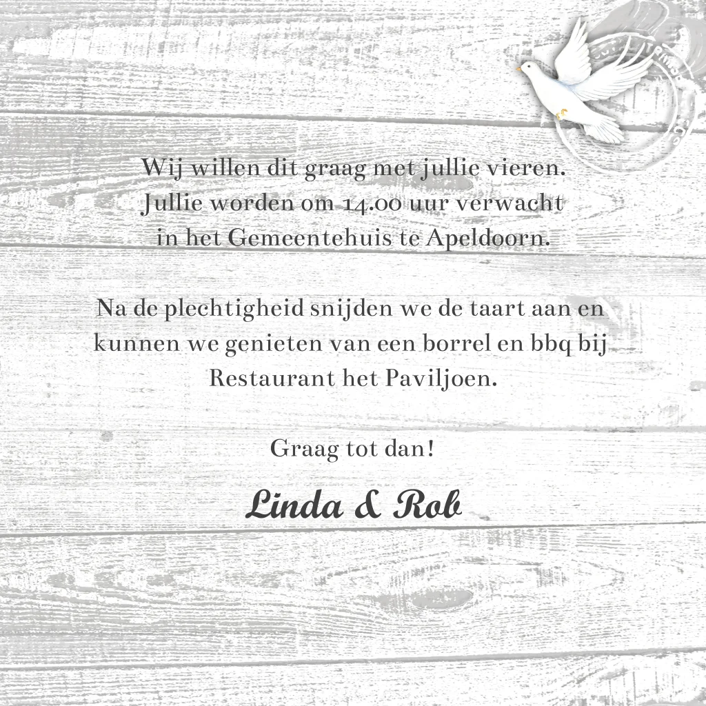 Trouwkaart in oude stijl met grijs hout en foto. Witte duiven en oude cabrio trouwauto met blikjes . (258)