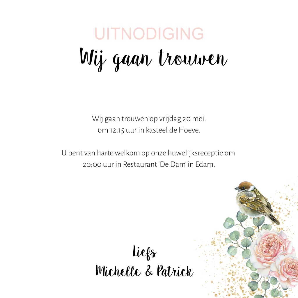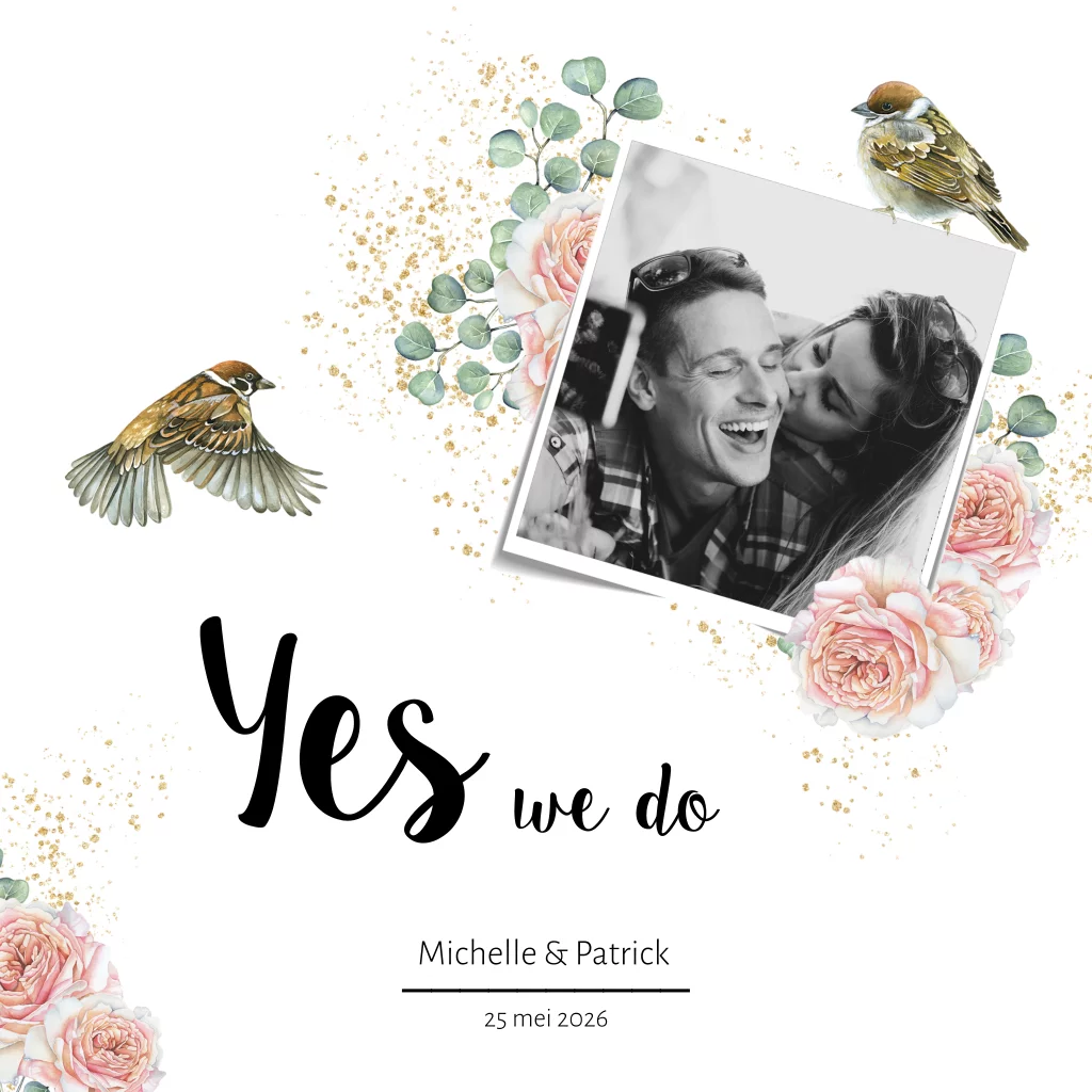 Trouwkaart met verlovingsfoto zwart-wit met mooie getekende rozen en lieve vogeltjes. (10155)