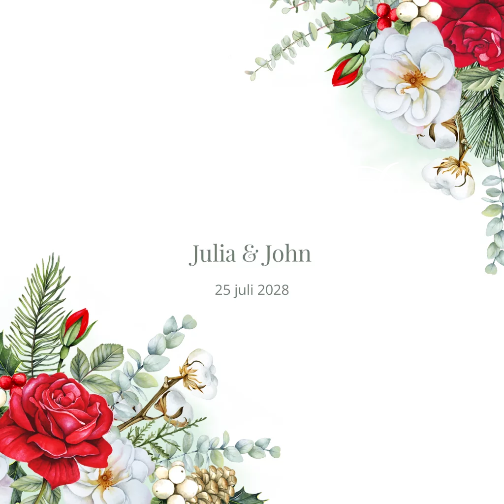 Trouwkaart met botanische takken, witte bloemen en getekende rode rozen. (24232)