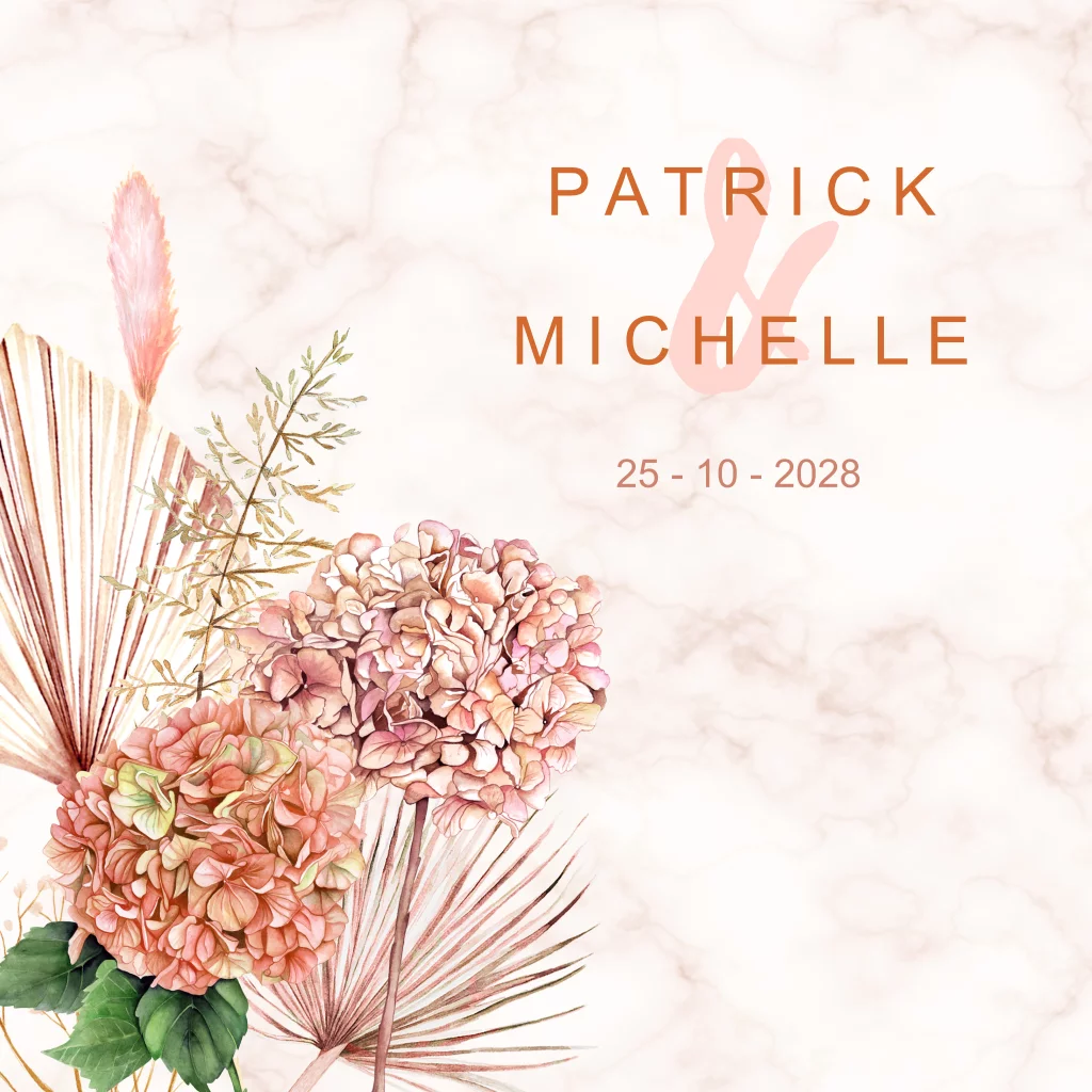 Trouwkaart uitnodiging feest of ceremonie met mooie sfeervolle hortensia bloemen en gedroogde bladeren. (22596)