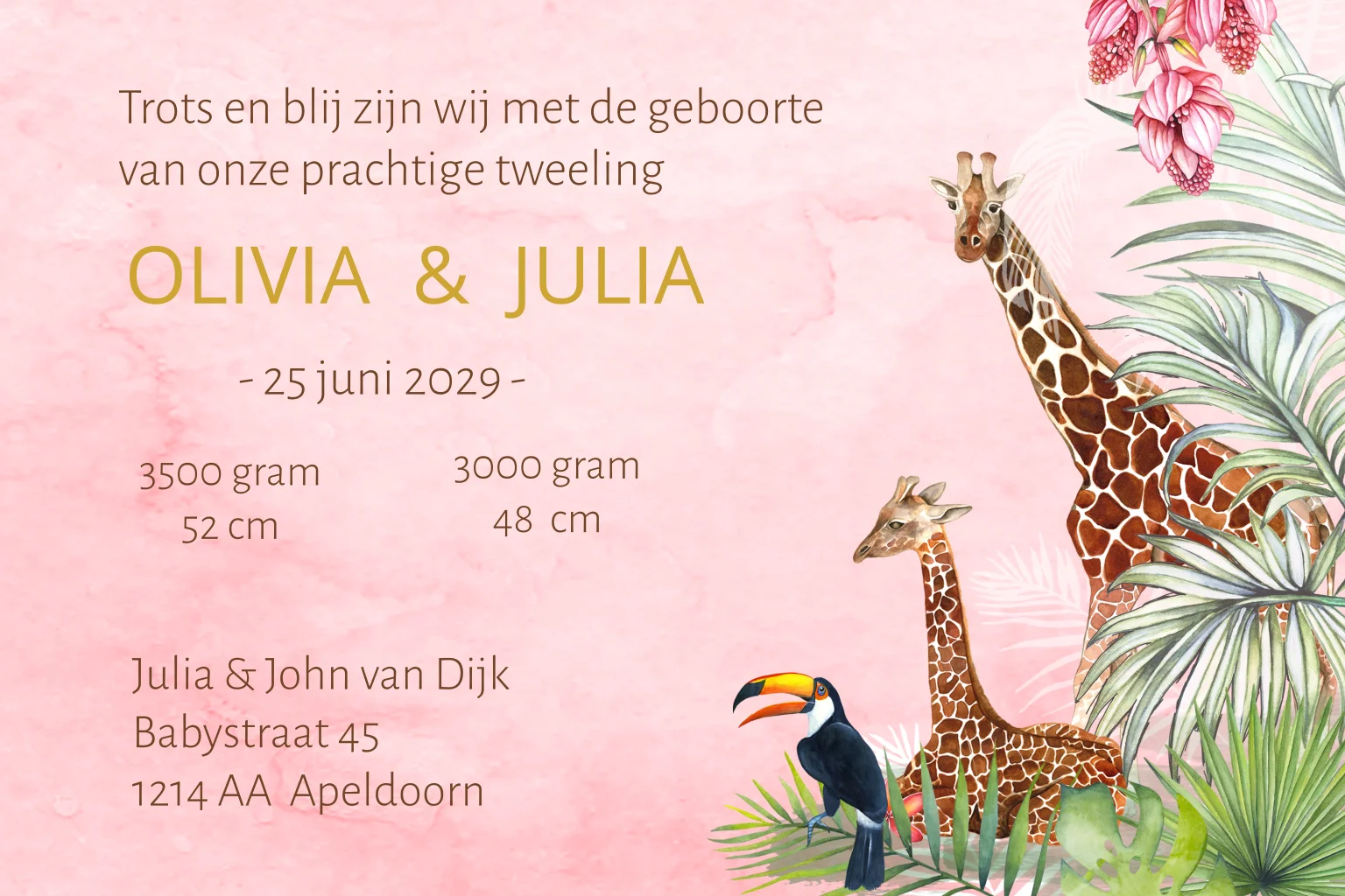 Geboortekaartje voor een tweeling in een jungle thema. Met roze achtergrond en verschillende dieren. (30139)