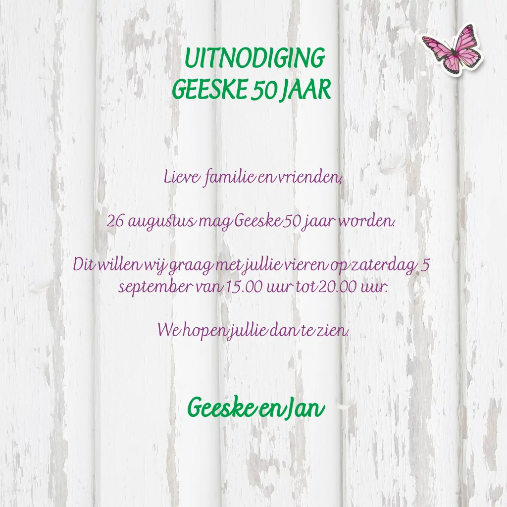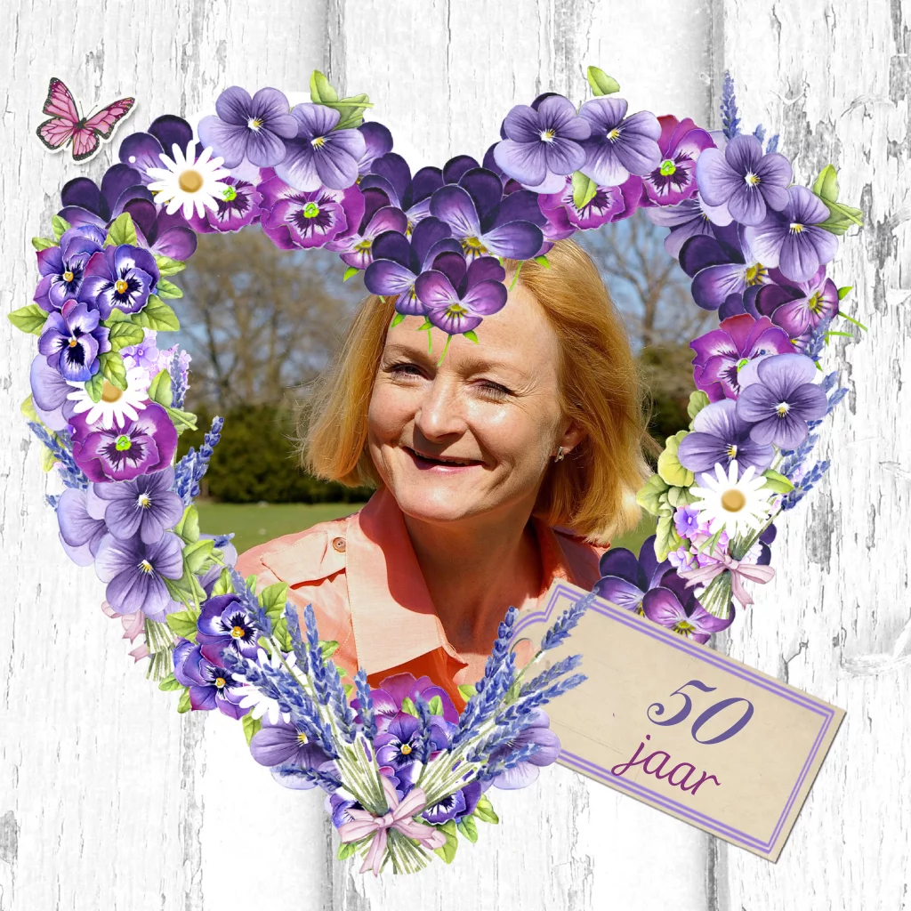 Foto uitnodiging verjaardag 50 jaar vrouw met een bloemenkrans met hart van paarse bloemen, vlinders en en afgeronde hoeken. (720)
