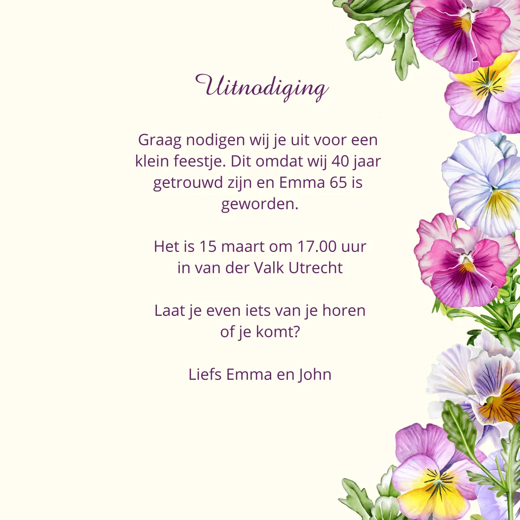 Uitnodiging voor een verjaardagsfeestje voor een vrouw of 50 jaar getrouwd feest met mooie gekleurde viooltjes in roze, lila en paars voor een vrouw (30355)