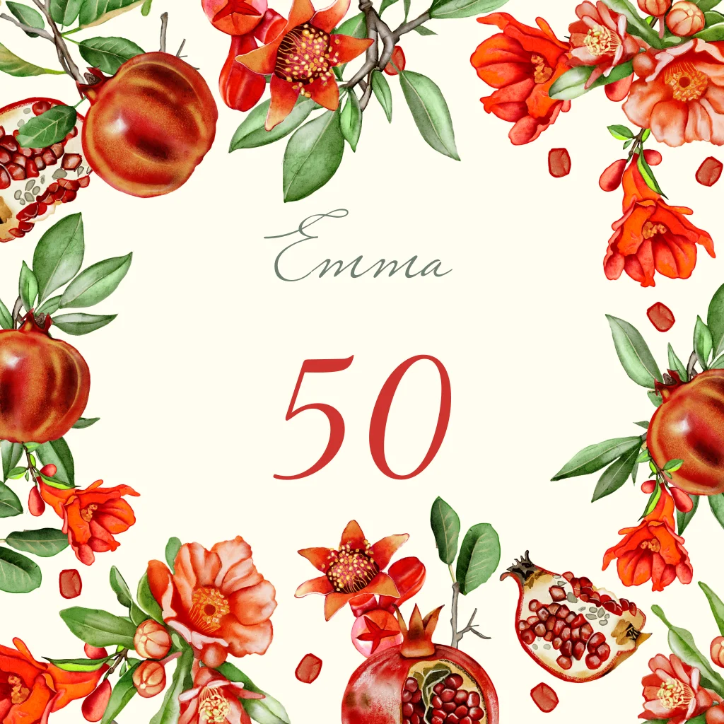 Uitnodiging voor een feestje 50 jaar vrouw met mooie granaatappels met bloemen. (30134)