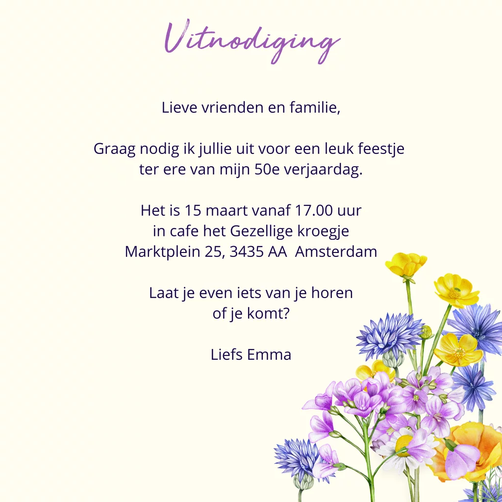 Uitnodiging voor een verjaardag 50 jaar met verschillende bloemen. (24461)
