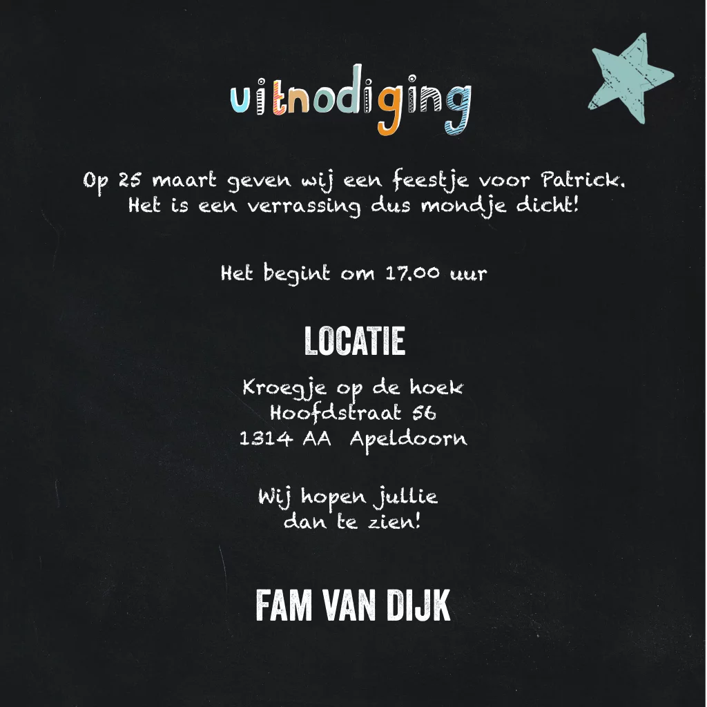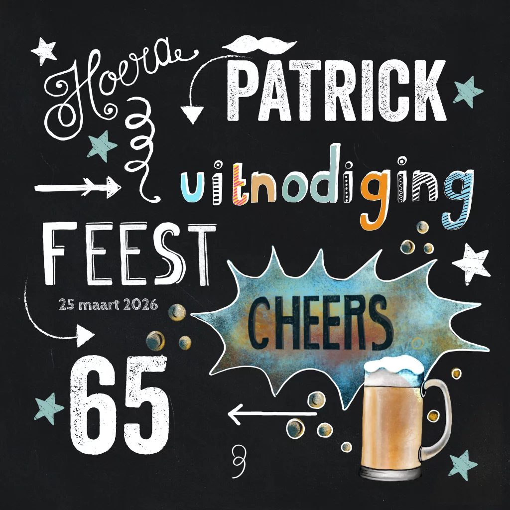 65 jaar uitnodiging op krijtbord versierd met handettering en bier. (20976)