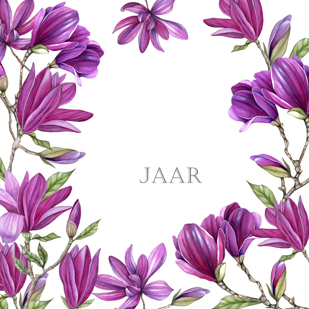 Verjaardagsuitnodiging met mooie paarse magnolia bloemen. (23876)