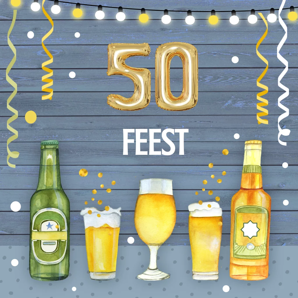 Leuke uitnodiging 50 jaar verjaardag met biertjes bier bierfeest op hout en tekstballon. (20973)