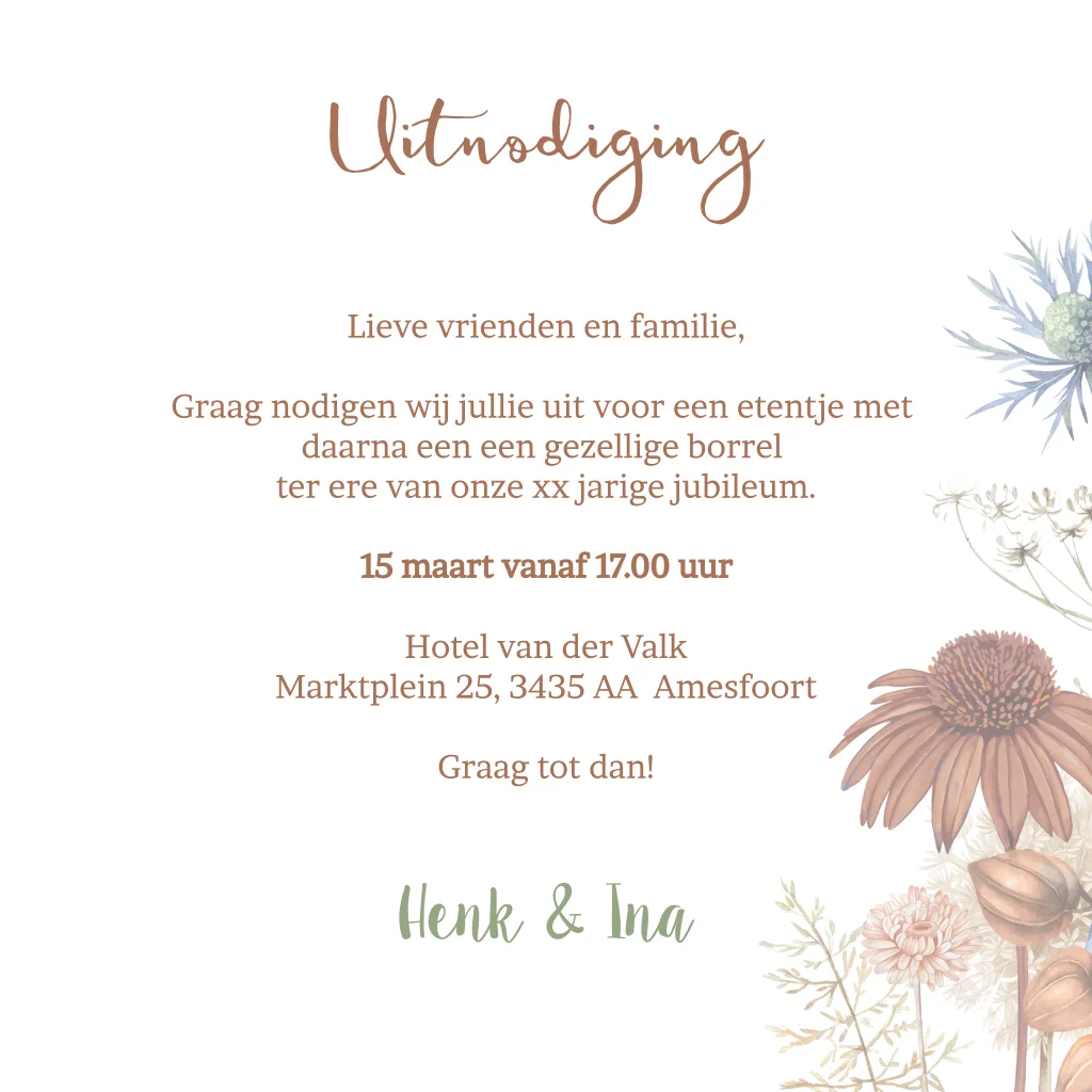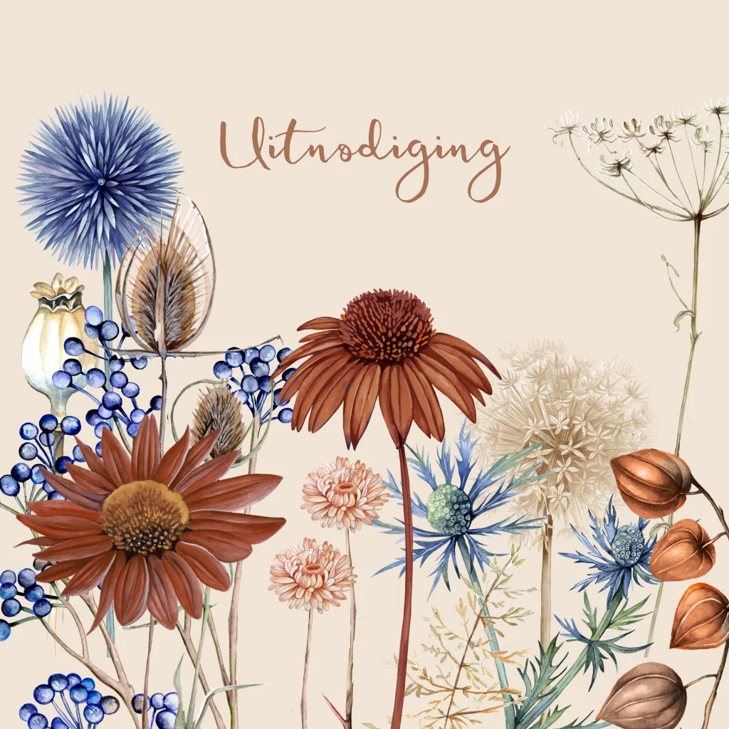 Uitnodiging feestje droogbloemen in bruin en blauw