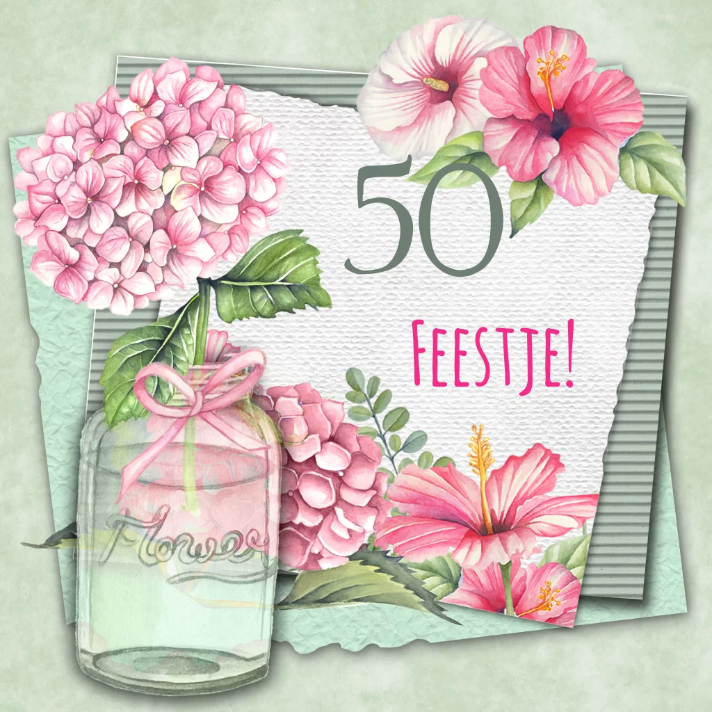 Uitnodiging voor een verjaardag 50 jaar met hortensia in een vaasje met achtergrond van papiertjes. (4987)