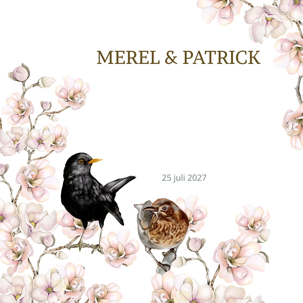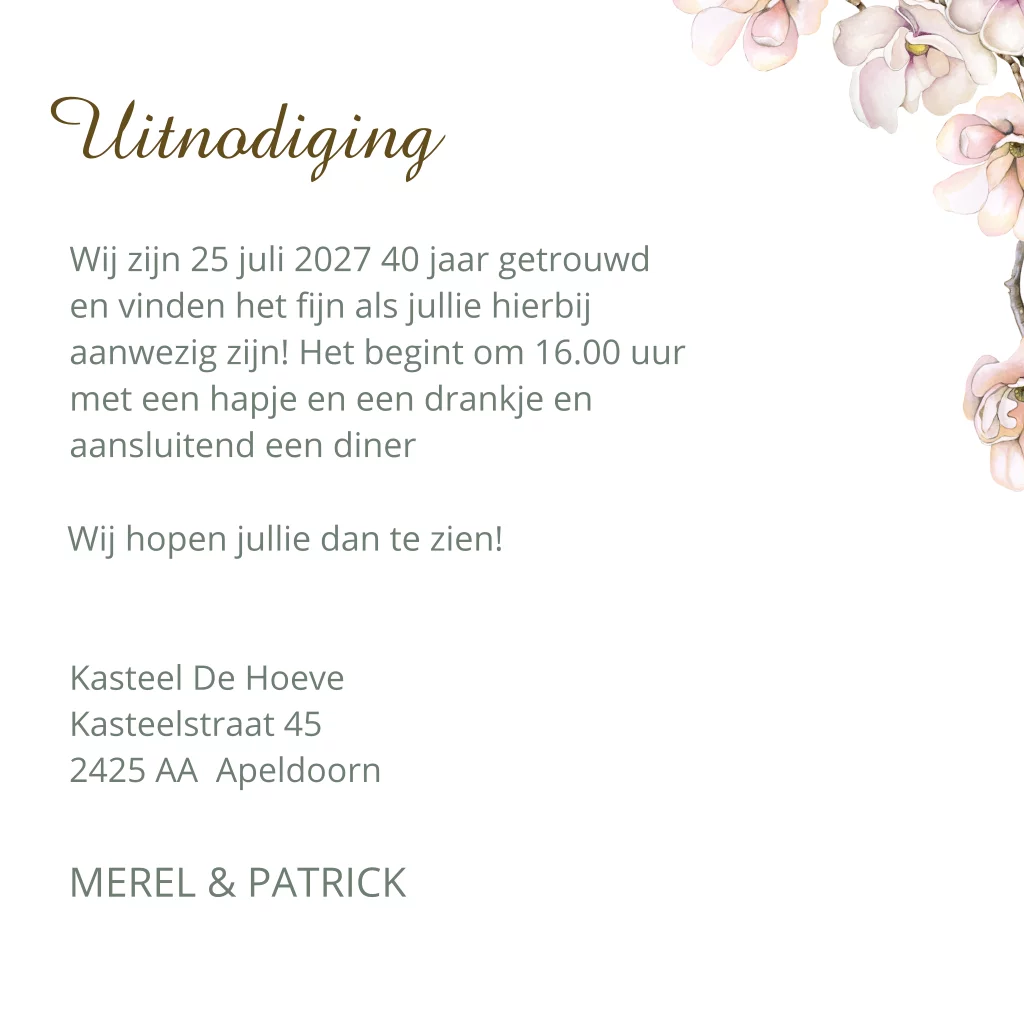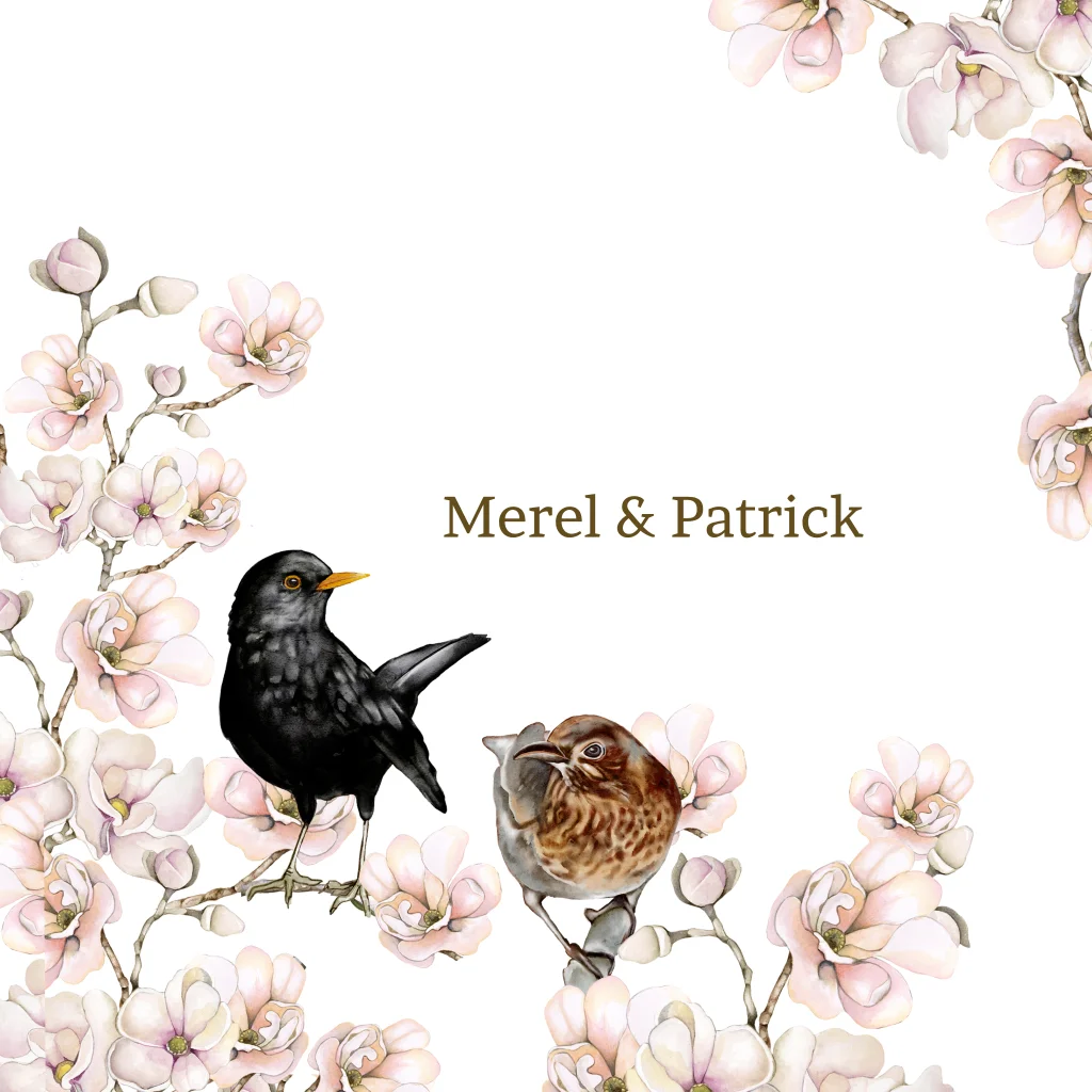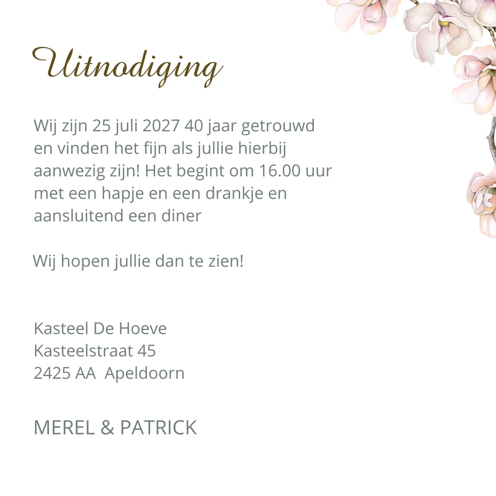 Uitnodiging 40 jarig huwelijksjubileum twee merels met bloesemtakken