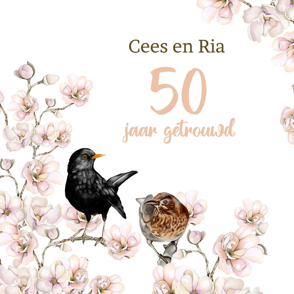 Uitnodiging 50 jaar getrouwd jubileumfeest met twee vogels op takken met. bloesem bloemen. De vogels zijn merels (23983)