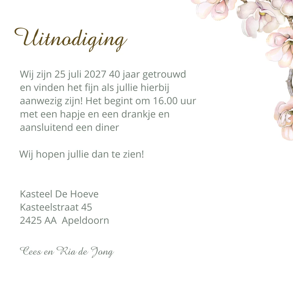 Uitnodiging 50 jaar jubileum feestje twee merels met bloesemtakken