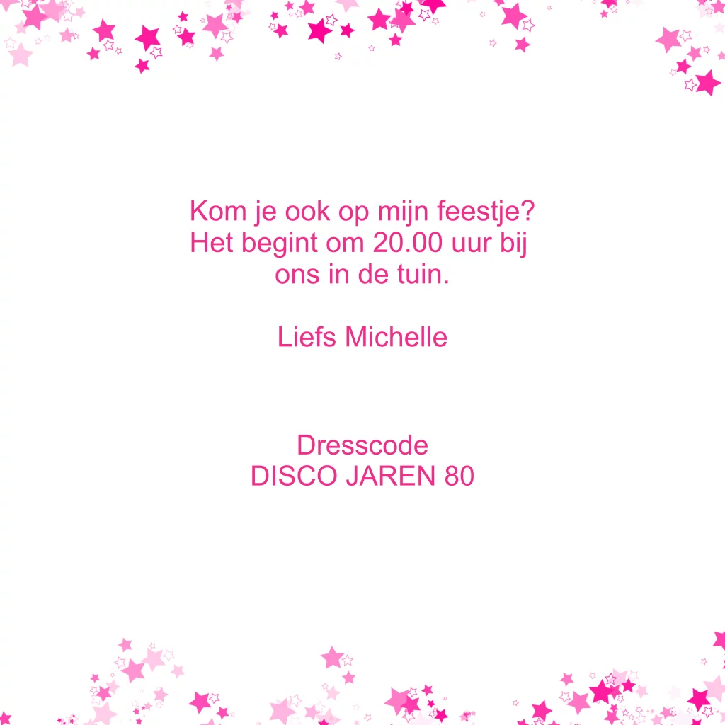 Uitnodiging disco feestje discobal met een roze glitter bal en roze versieringen. Aan de binnenkant kun je een foto plaatsen (24139)