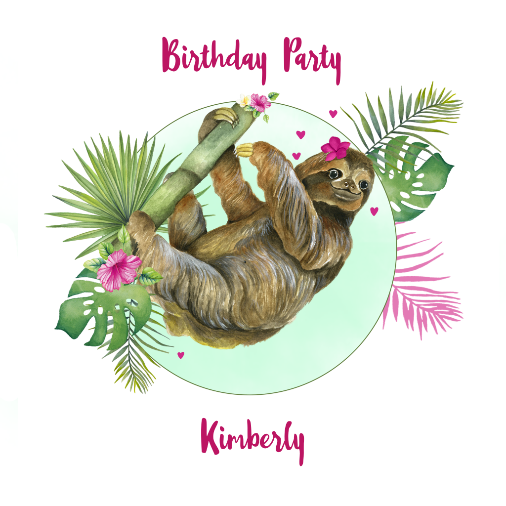 Uitnodiging voor een verjaardagsfeestje met leuke luiaard in tropische sfeer. (22407)
