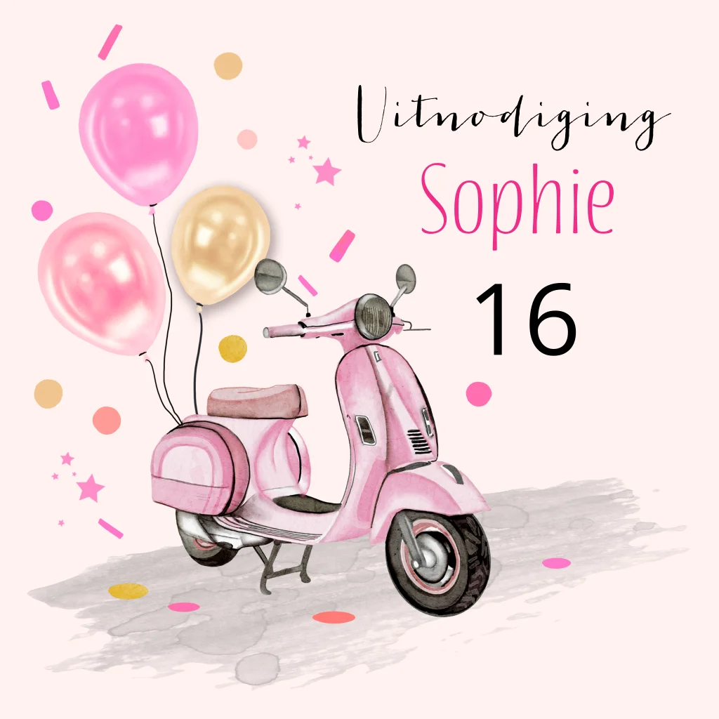 Uitnodiging voor een verjaardagsfeestje voor een meisje met leuke roze scooter versierd met ballonnen (24727)