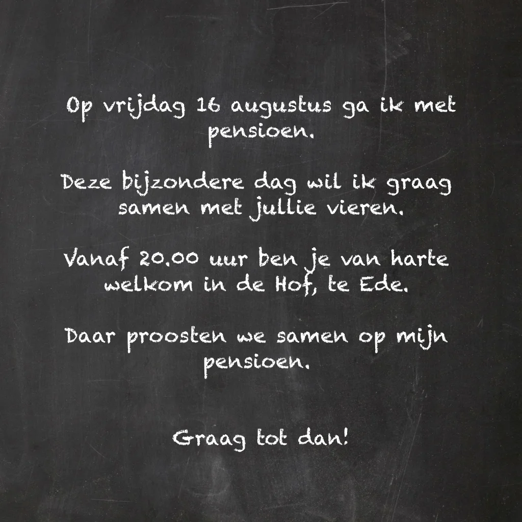 Pensioen borrel uitnodiging met wijnflessen en wijnglazen op een krijtbord. (4837)