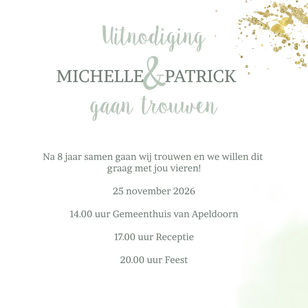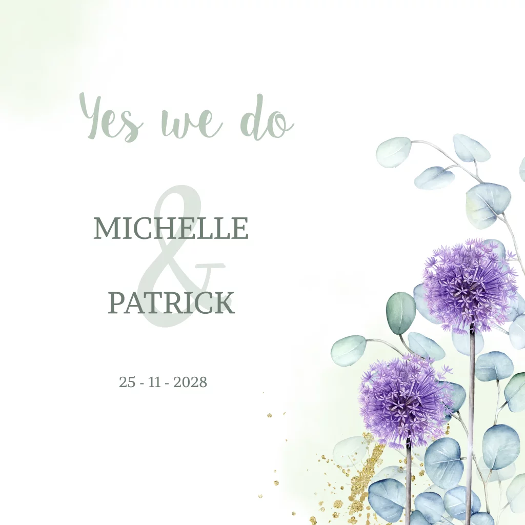 Trouwkaart met mooi getekende eucalyptus bloemen takjes en paarse bloemen. (21337)