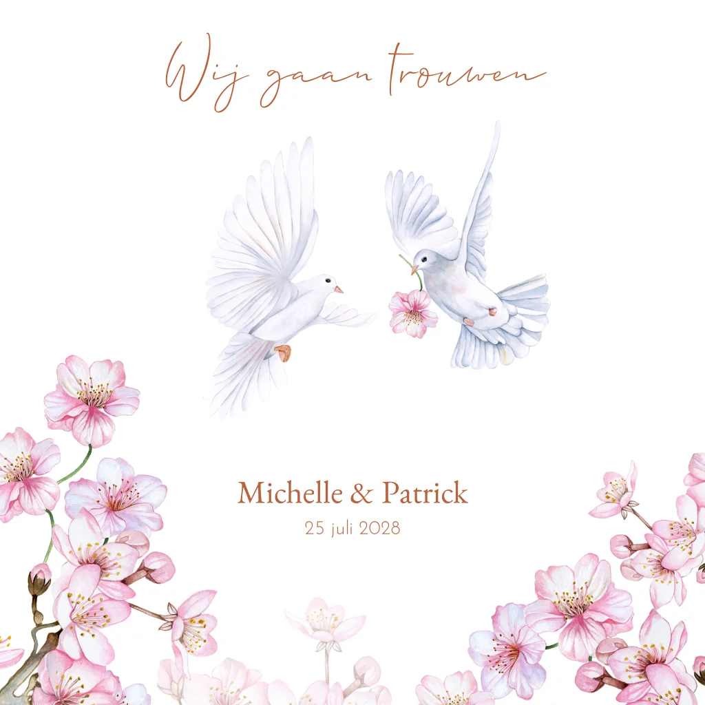 Trouwkaart witte duiven roze bloesem