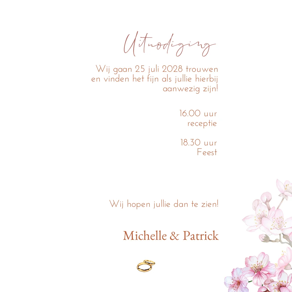 Trouwkaarten met roze bloesem bloesem en witte duifjes / duiven om jullie gasten uit te nodigen voor jullie bruiloft. (24140)