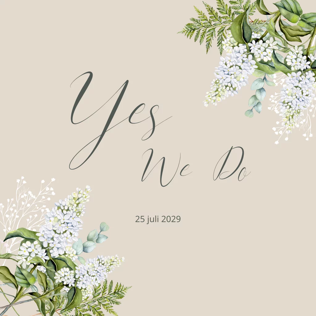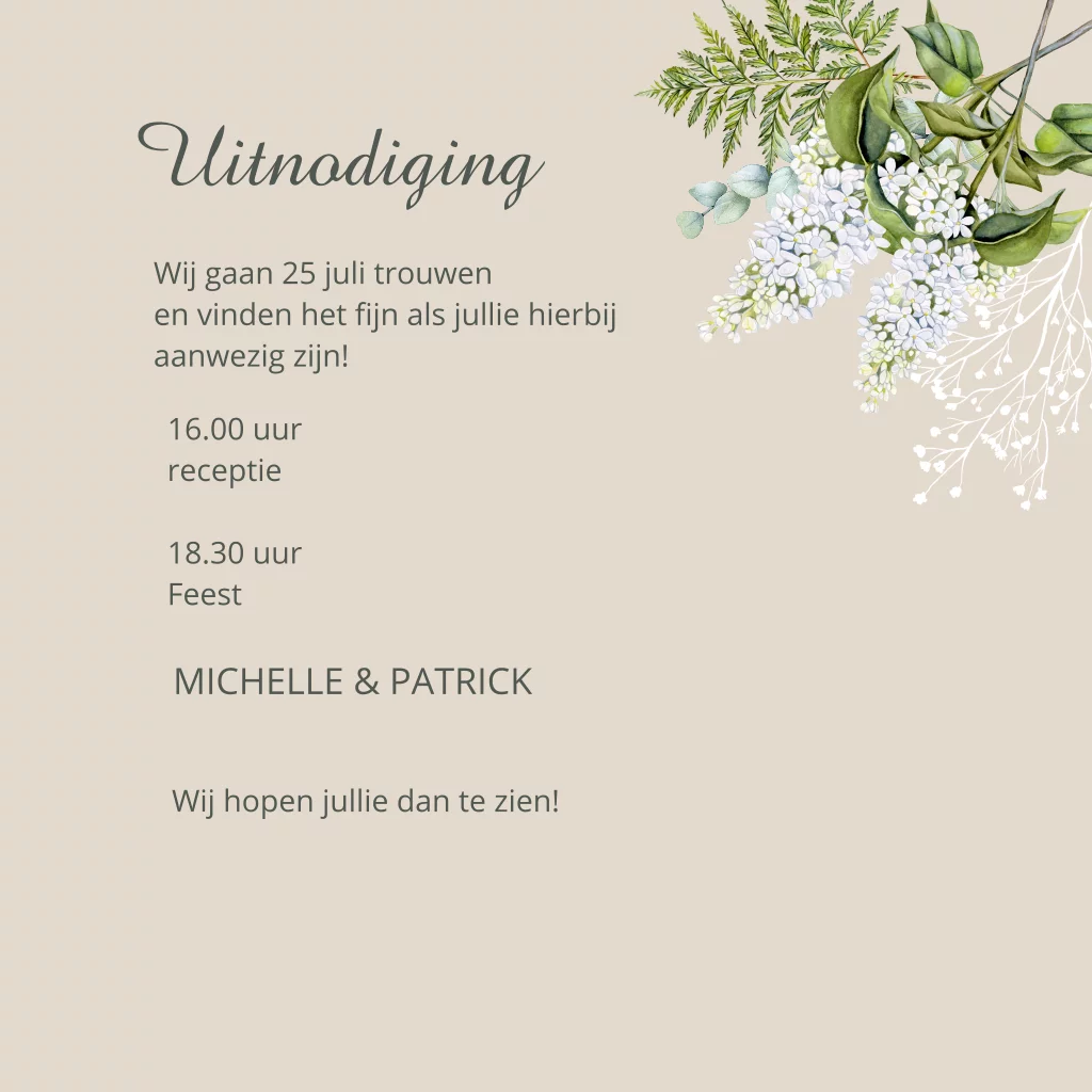 Trouwkaart met mooie witte seringen en eucalyptus blad. (23549)