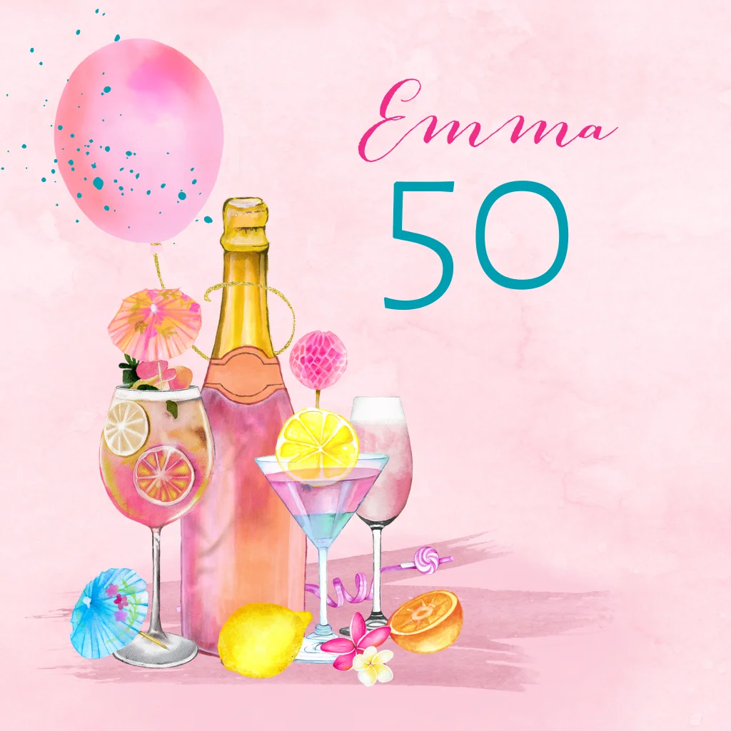 Uitnodiging 50 jaar voor een verjaardagsfeestje met champagne en tropische drankjes voor een feest in zomerse sferen. (30137)