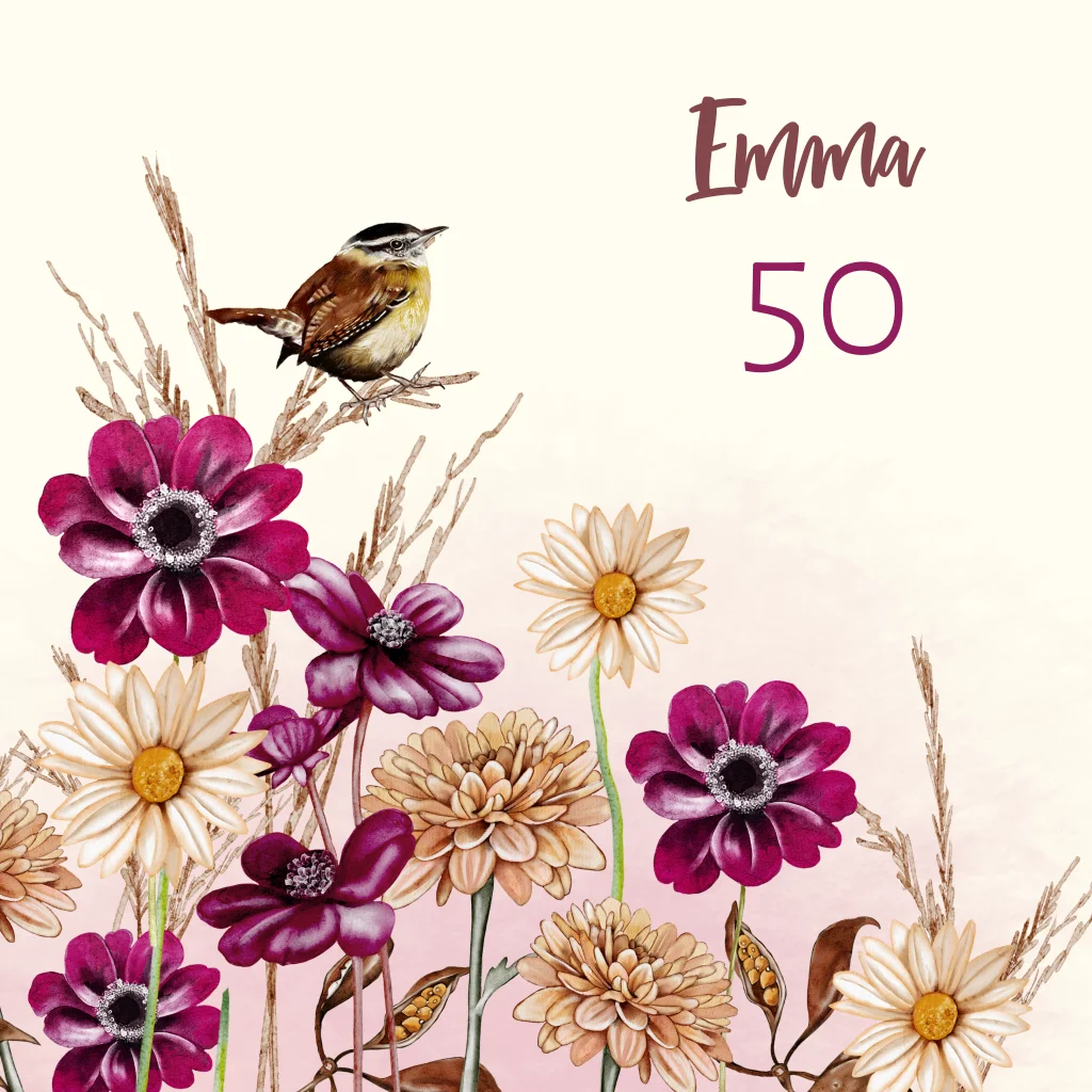 Uitnodiging 50e verjaardag vrouw met bloemen en vogeltje