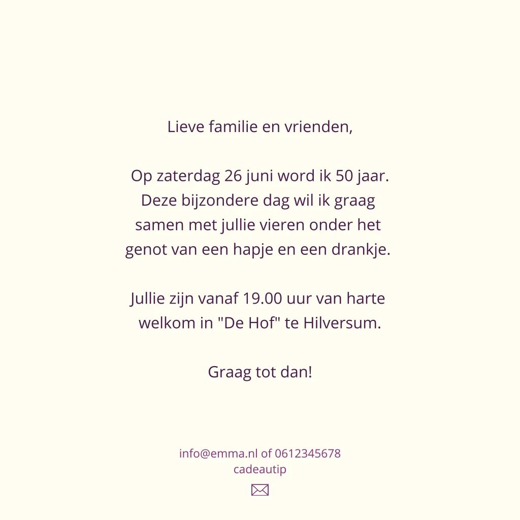 50 jaar uitnodiging voor een verjaardag van een vrouw met paarse en beige bloemen en een musje op een tak. (30131)