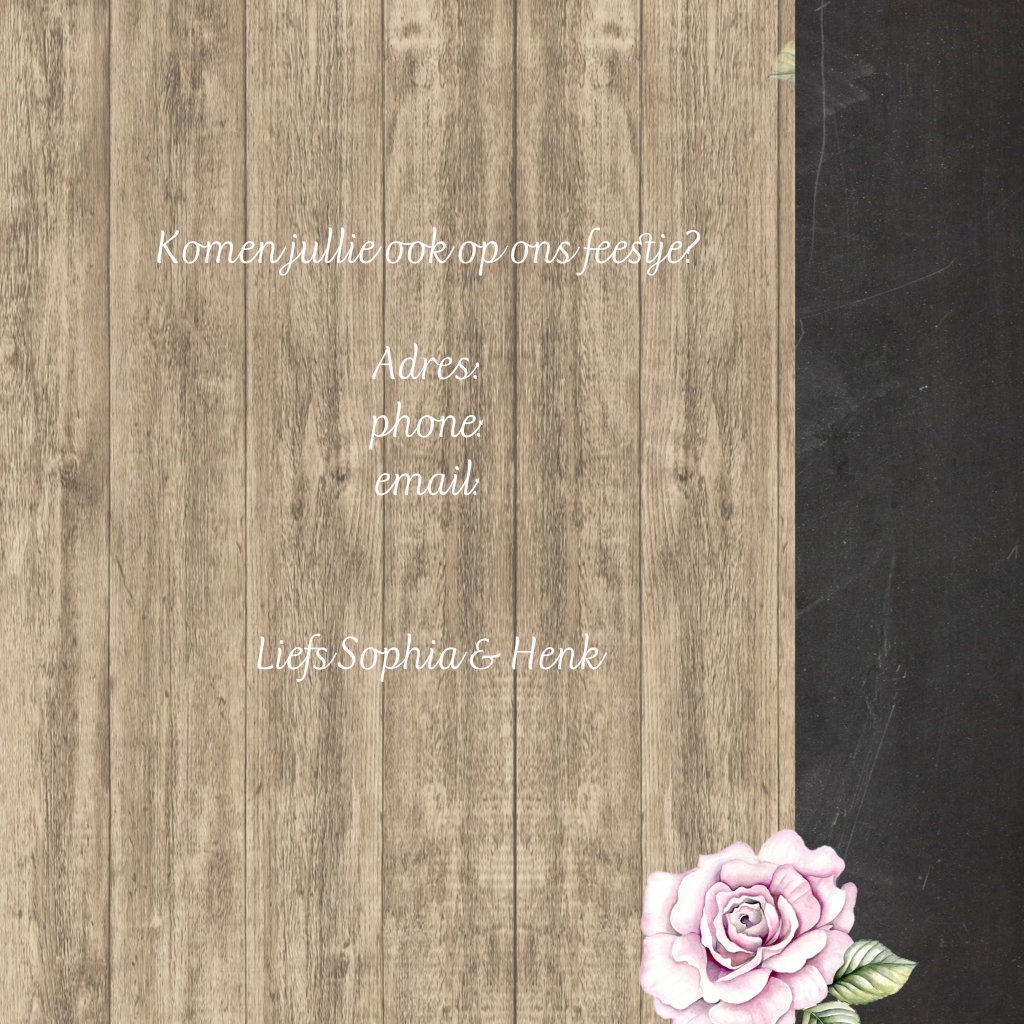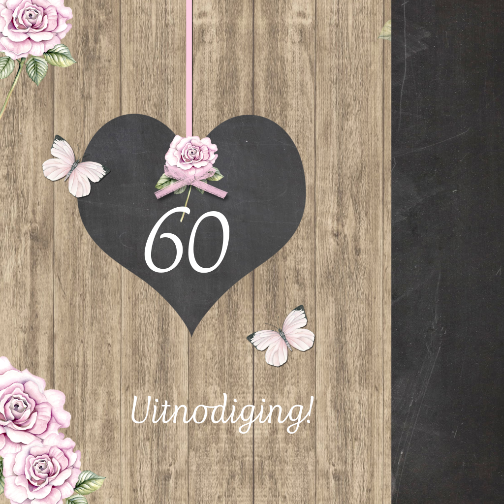 Uitnodiging verjaardag 60 jaar met hart als krijtbord versierd met rozen en lint op houtprint. (3711)