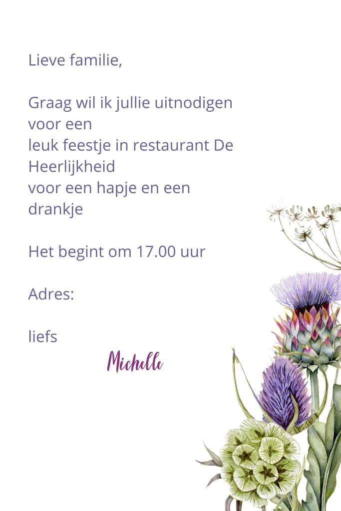 Uitnodiging staande kaart met mooie botanische artisjok bloemen. (24099)
