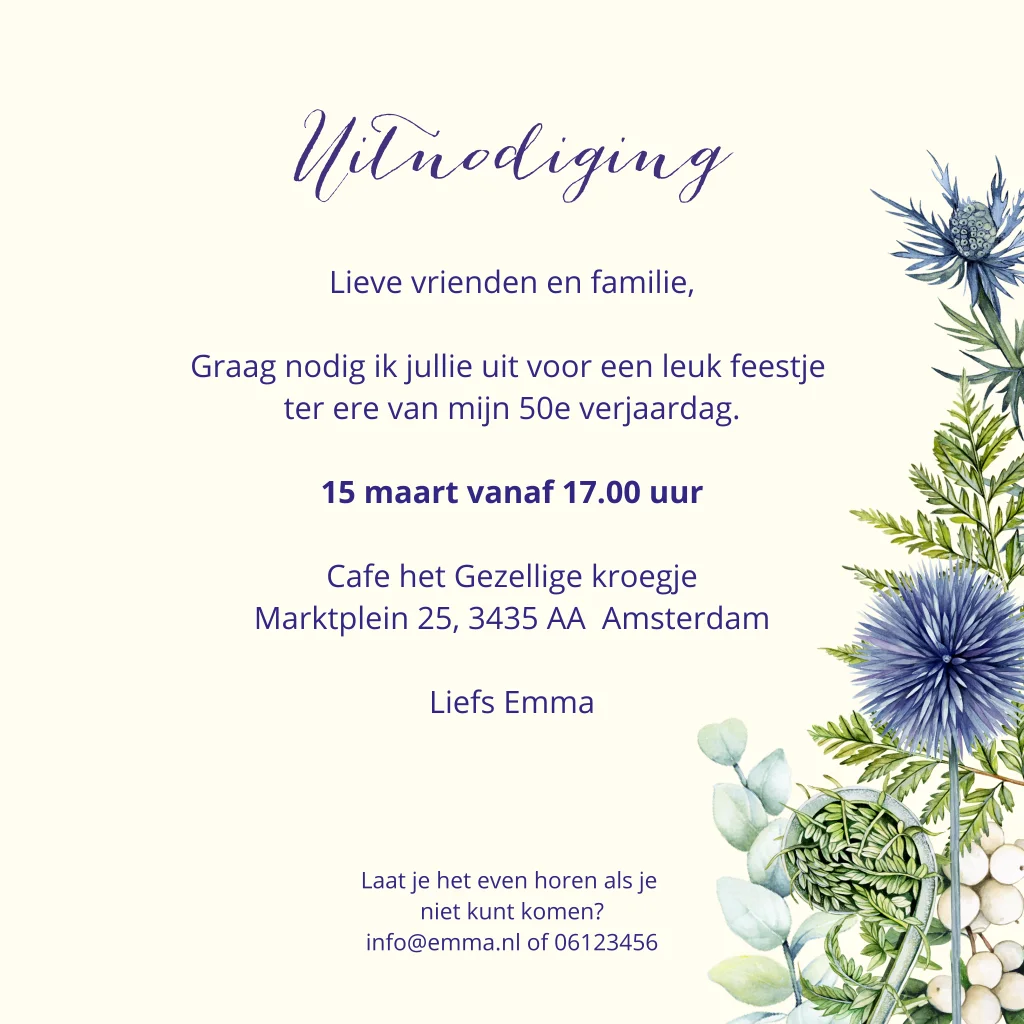 Uitnodiging voor een verjaardag of feestje met mooie botanische planten en bladeren in blauw, groen en wit. (24200) (Deze kaart heeft nu ronde hoeken a € 0,30 extra per kaart, in je kunt dit ook met rechte hoeken bestellen)