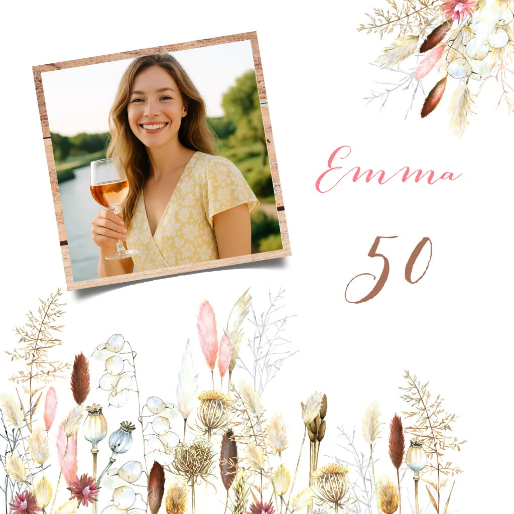 Uitnodiging verjaardagsfeest vrouw 50 jaar met foto sara met mooie droogbloemen. (20929)