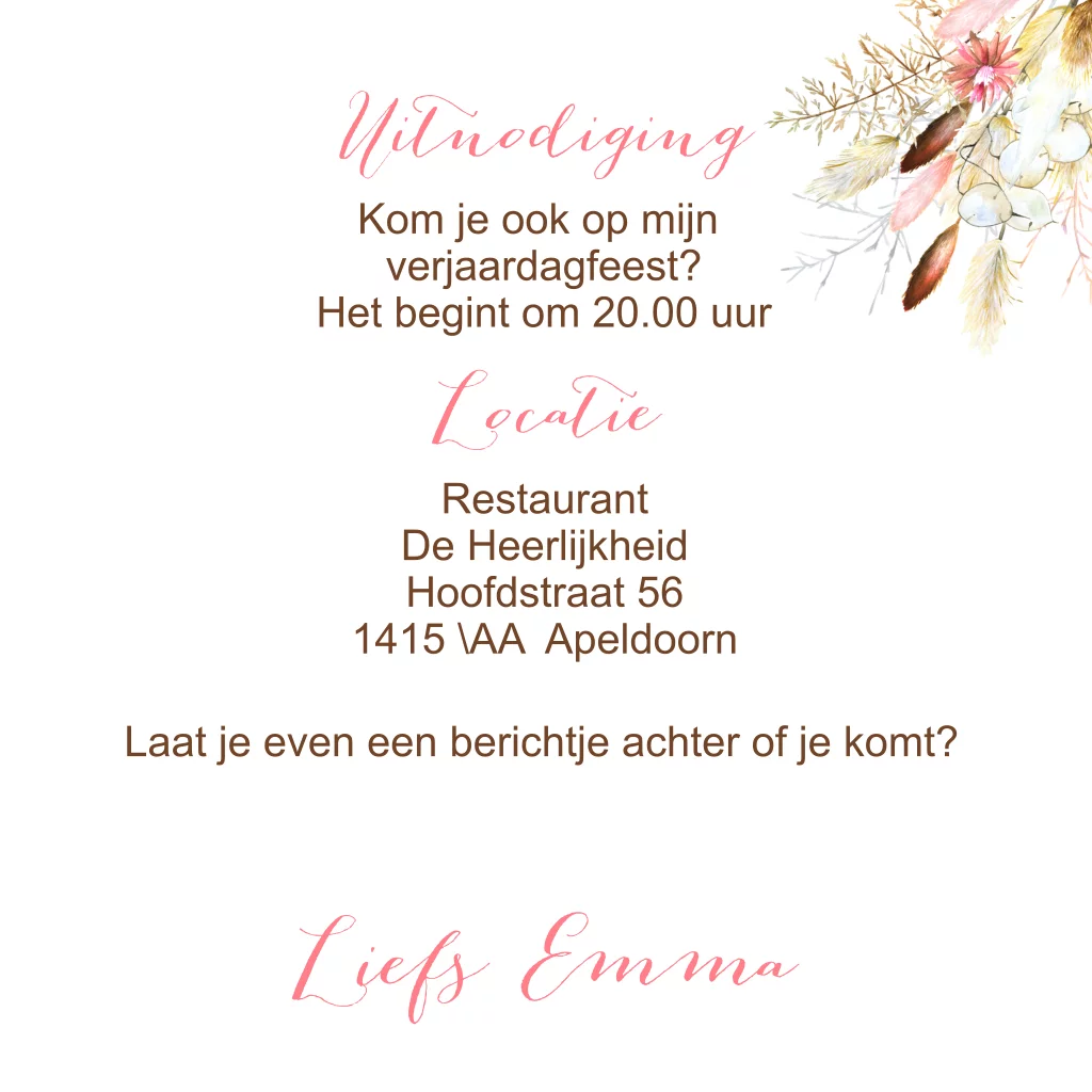 Uitnodiging verjaardag 50 jaar vrouw met droogbloemen vijftig